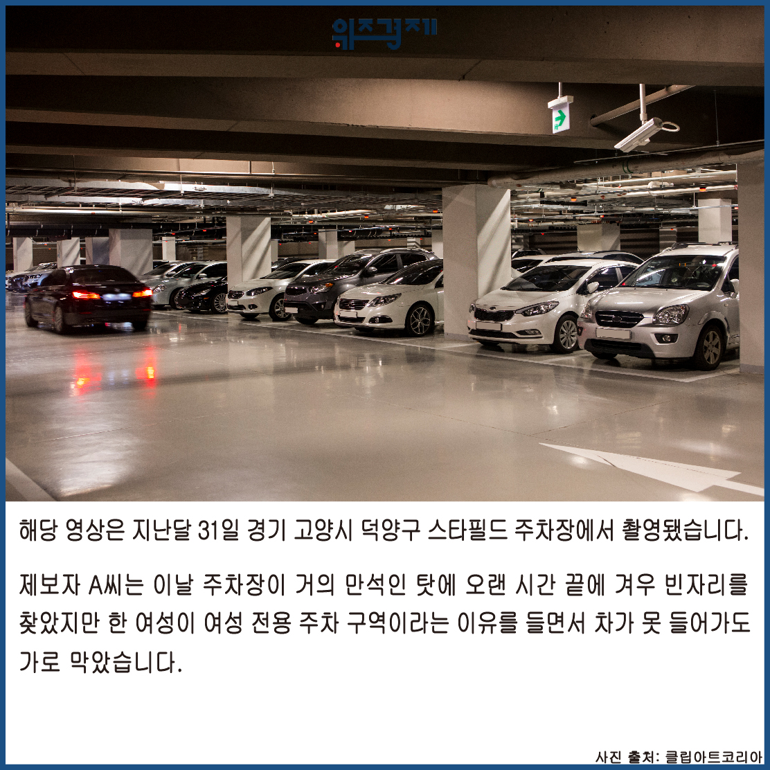 [위즈경제] 이정원 기자 =대형 쇼핑몰 여성전용 주차구역에서 자리를 맡은 여성과 차를 주차하려는 남성 사이에 실랑이가 벌여졌다는 사연이 전해졌습니다.