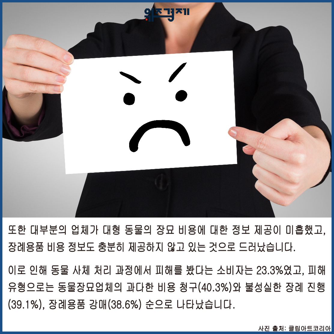 이로 인해 동물 사체 처리 과정에서 피해를 봤다는 소비자는 23.3%였고, 피해 유형으로는 동물장묘업체의 과다한 비용 청구(40.3%)와 불성실한