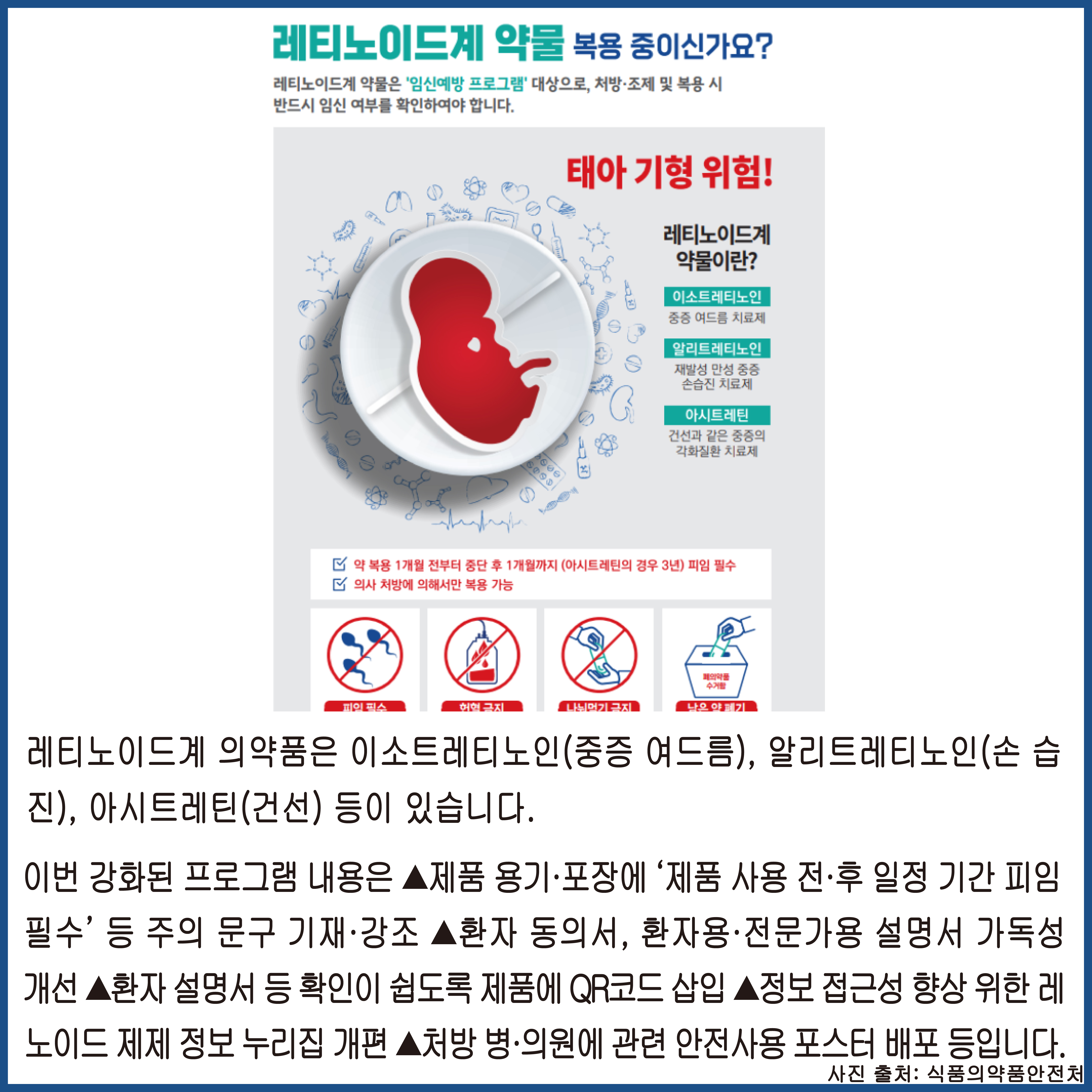 이에 식품의약품안전처는 이소트레티노인 등 레티노이드계 의약품 용기·포장에 주의 문구를 기재하는 등 ‘임신예방
