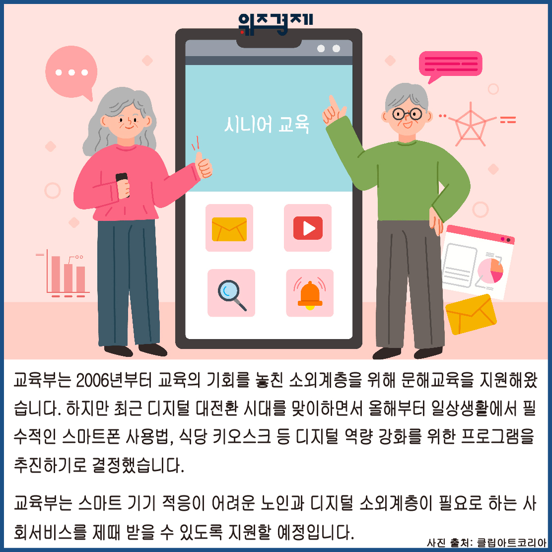 교육부는 2006년부터 교육의 기회를 놓친 소외계층을 위해 문해교육을 지원해왔습니다. 하지만 최근 디지털 대전환 시대를 맞이하면서 올해부터 일상생활에서 필수적인 스마트폰 사용법, 식당 키오스크 등 디지털 역량 강화를 위한 프로그램을 추진하기로 결정했습니다.