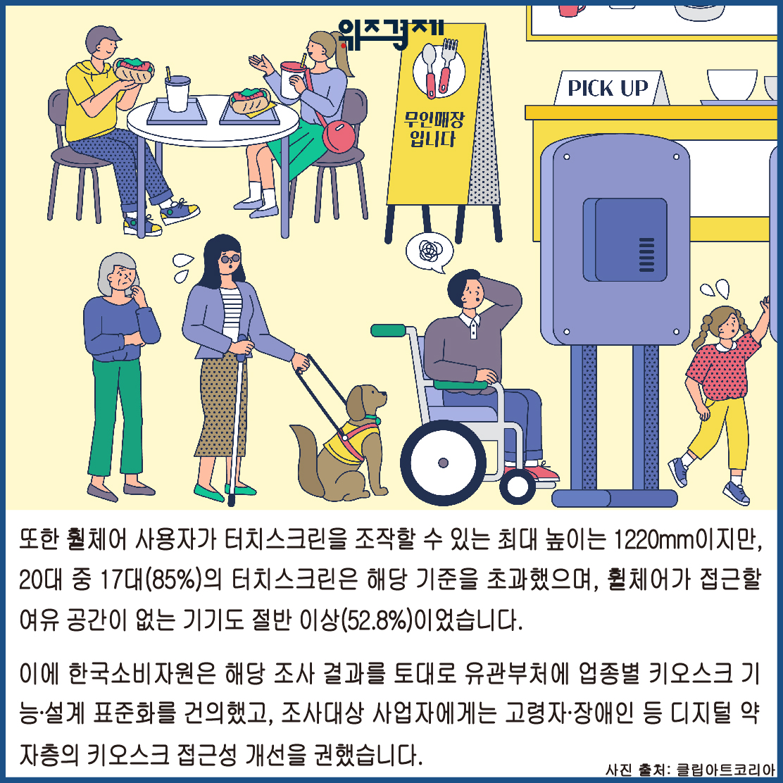키오스크는 휠체어가 접근 가능한 위치에 설치돼야 하고, 키오스크 하단엔 휠체어 발판이 들어갈 수 있는