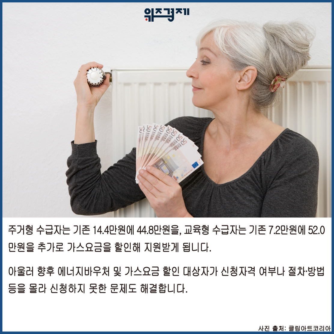 주거형 수급자는 기존 14.4만원에 44.8만원을, 교육형 수급자는 기존 7.2만원에 52.0만원을 추가로 가스요금을 할인해 지원받게 됩니다.