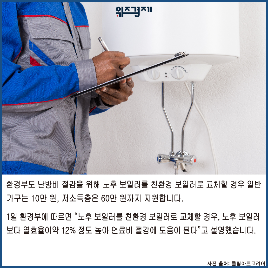 환경부도 난방비 절감을 위해 노후 보일러를 친환경 보일러로 교체할 경우 일반 가구는 10만 원, 저소득층은 60만