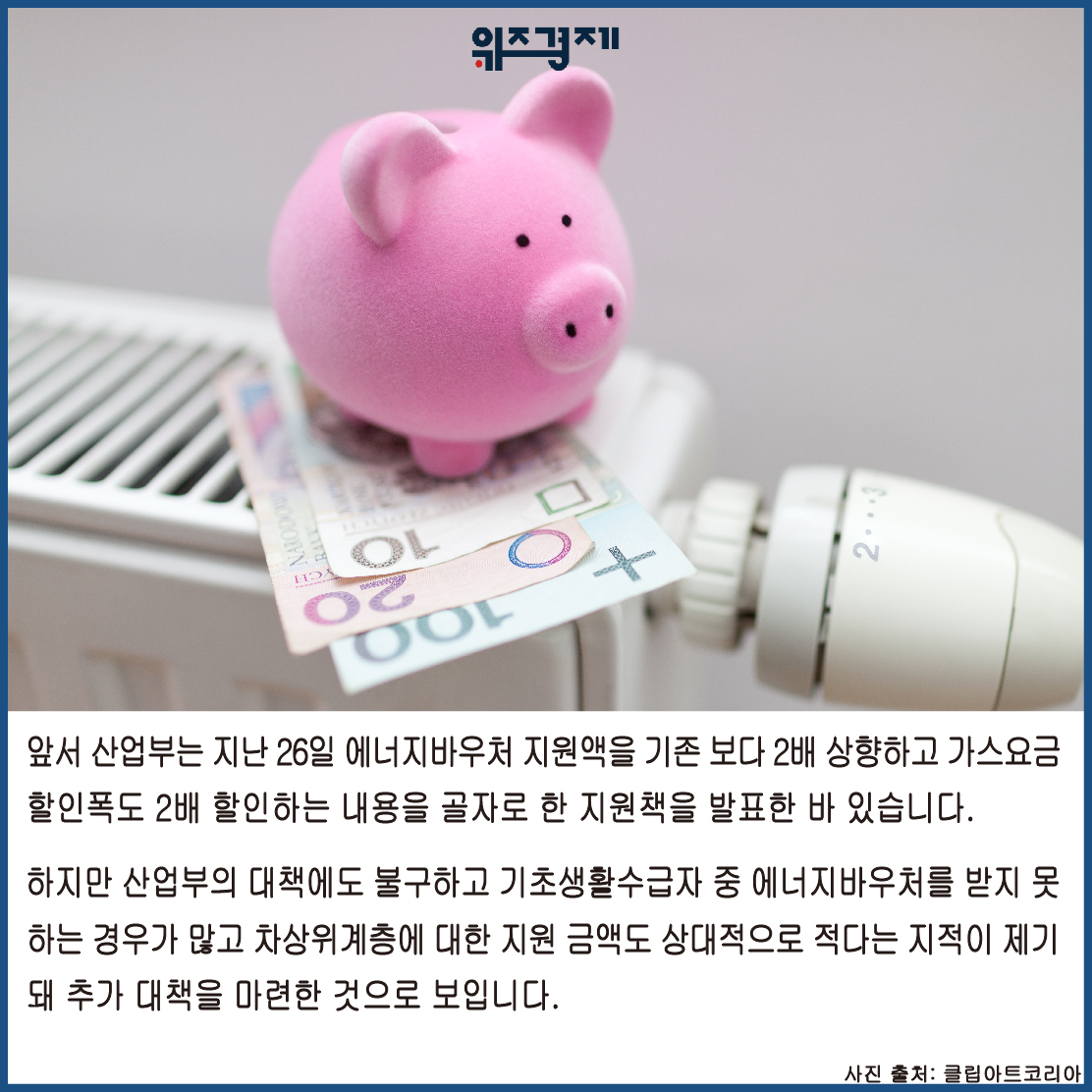 앞서 산업부는 지난 26일 에너지바우처 지원액을 기존 보다 2배 상향하고 가스요금 할인폭도 2배 할인하는 내용을 골자로 한 지원책을