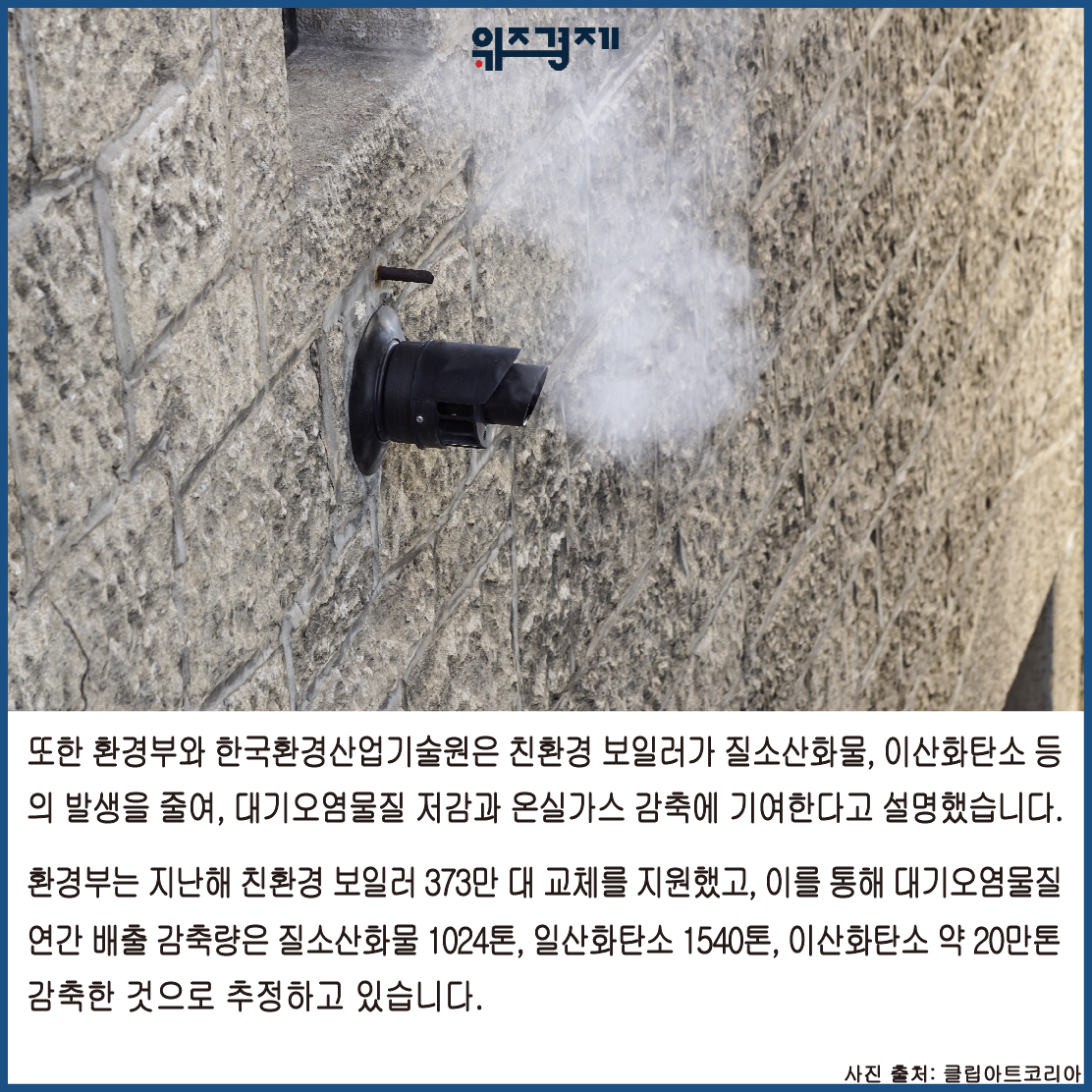 환경부는 지난해 친환경 보일러 373만 대 교체를 지원했고, 이를 통해 대기오염물질 연간 배출 감축량은 질소산화물 1024톤, 일산화탄소 1540톤, 이산화탄소