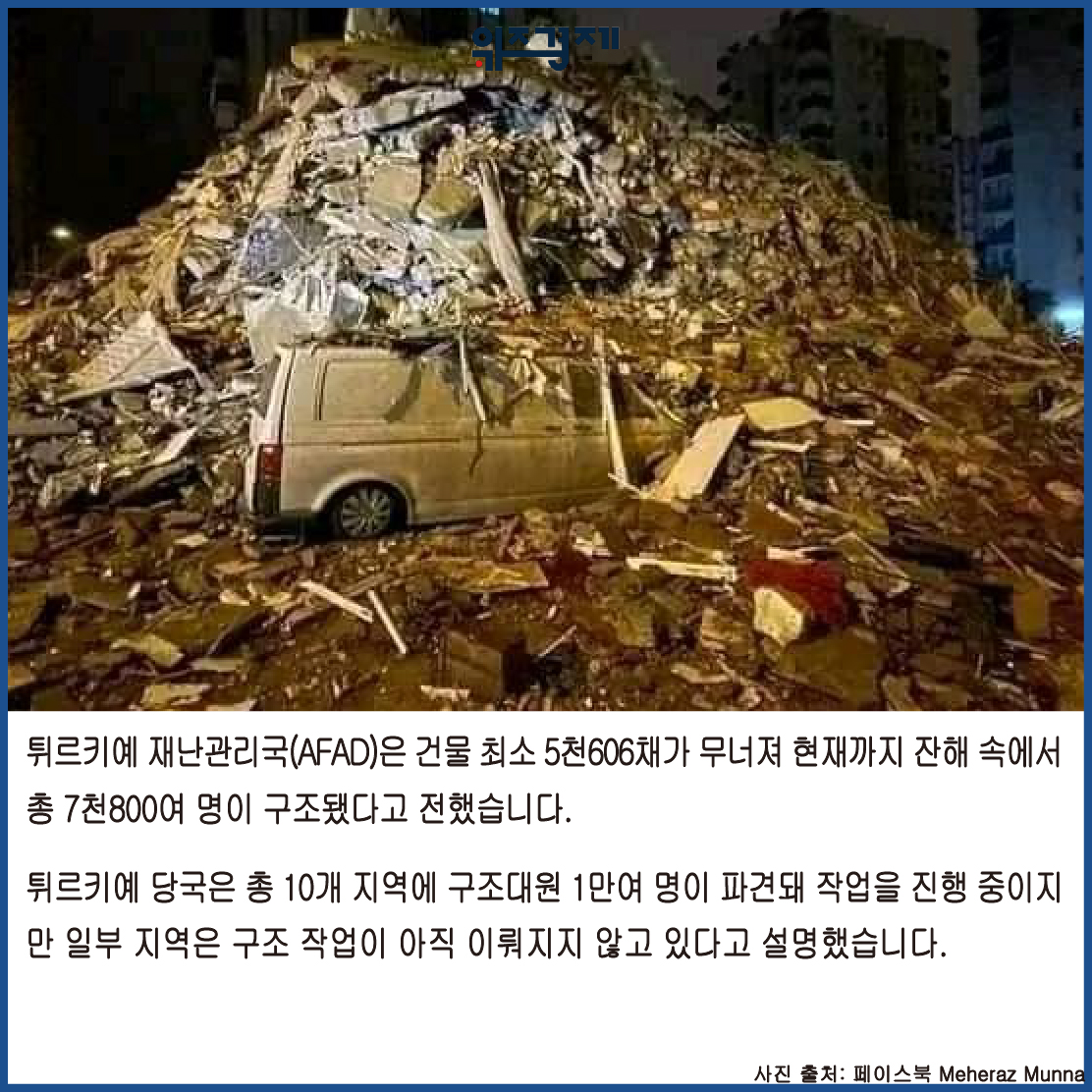 튀르키예 재난관리국(AFAD)은 건물 최소 5천606채가 무너져 현재까지 잔해 속에서 총 7천800여 명이 구조됐다고 전했습니다.