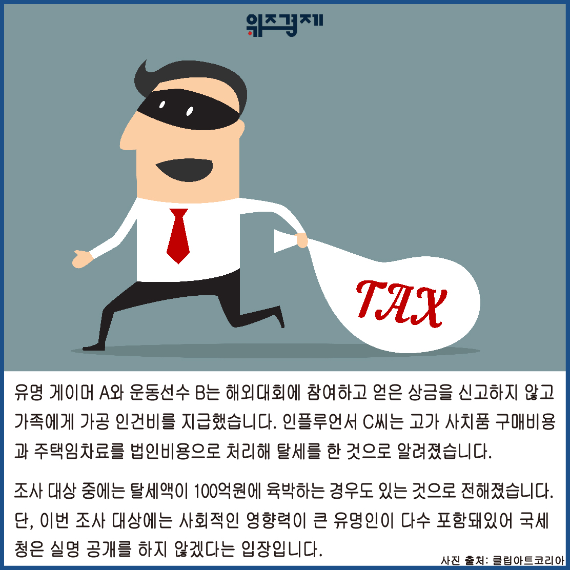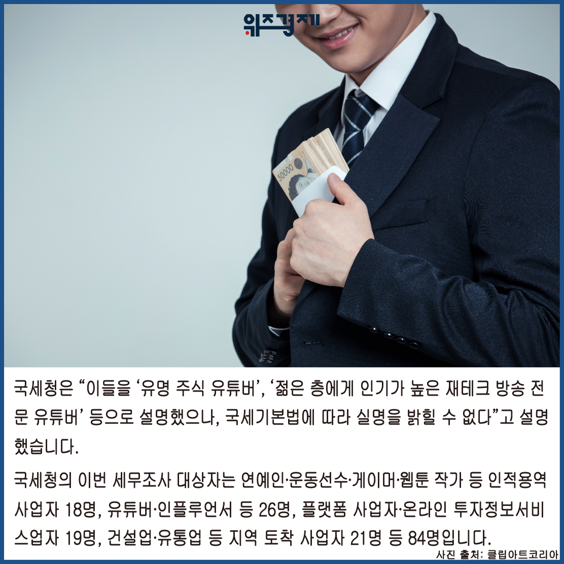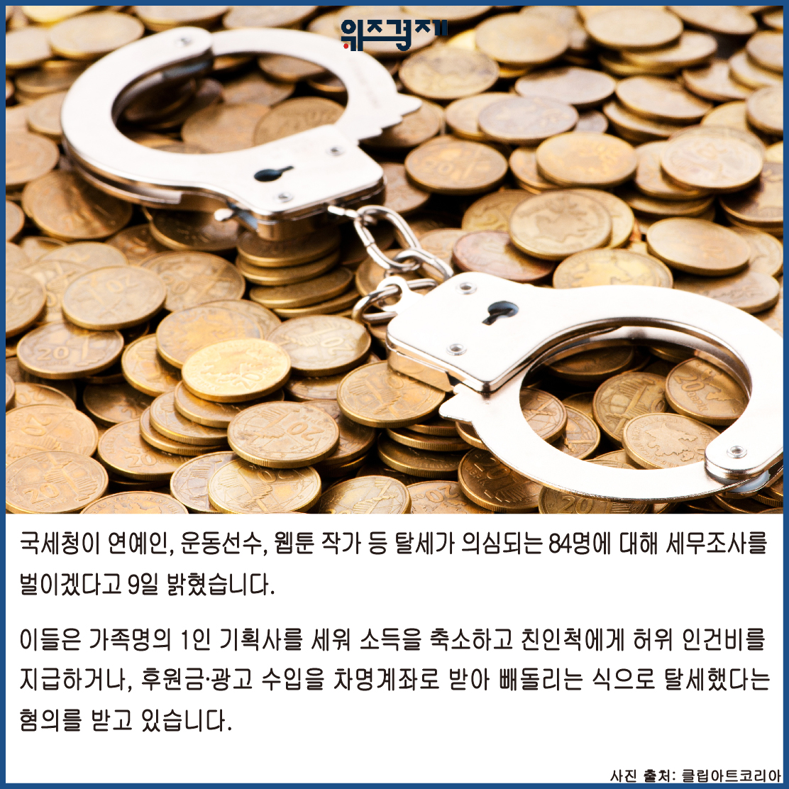 [위즈경제] 이정원 기자 =국세청이 연예인, 운동선수, 웹툰 작가 등 탈세가 의심되는 84명에 대해 세무조사를 벌이겠다고 9일 밝혔습니다.