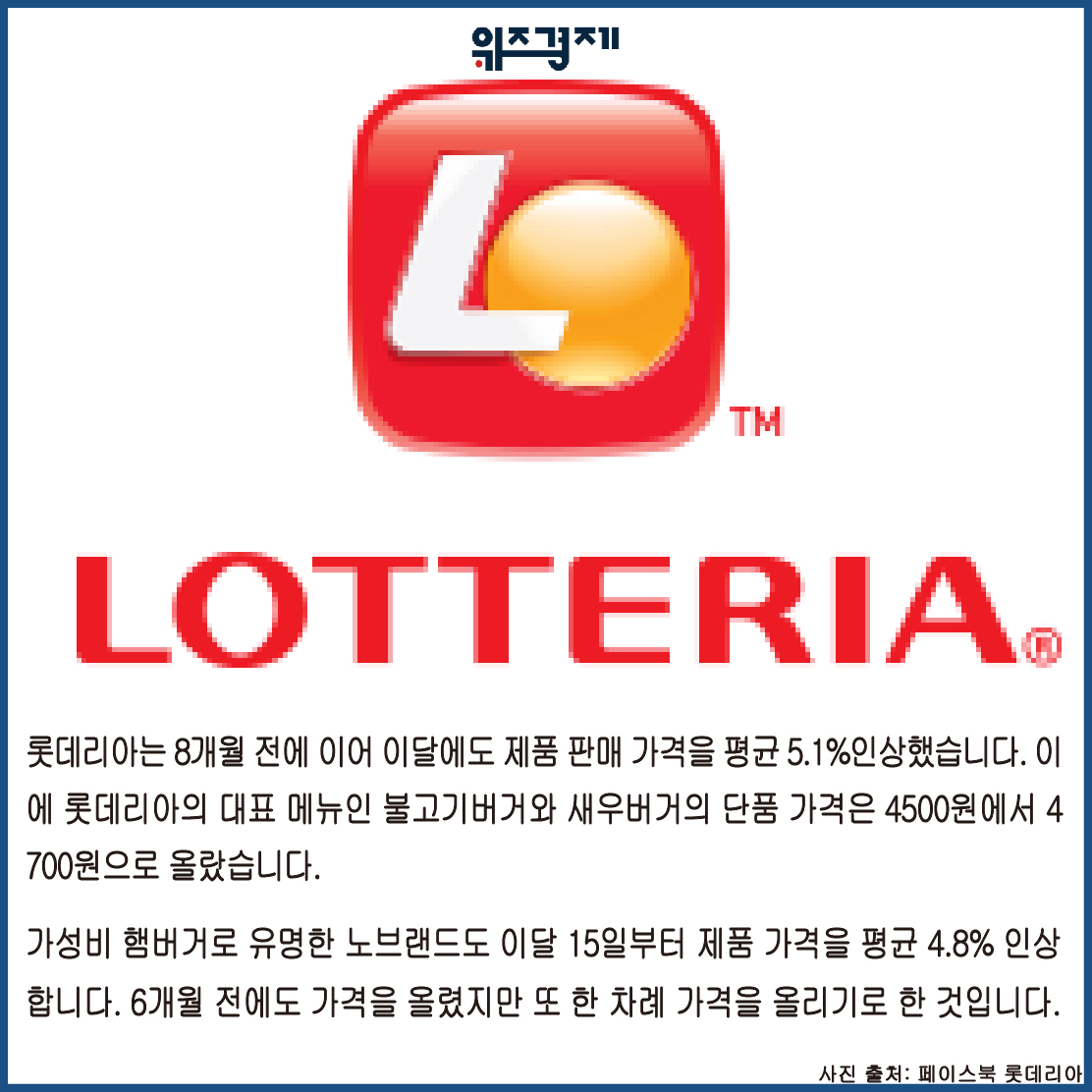 롯데리아는 8개월 전에 이어 이달에도 제품 판매 가격을 평균 5.1%인상했습니다. 이에 롯데리아의 대표 메뉴인 불고기버거와 새우버거의