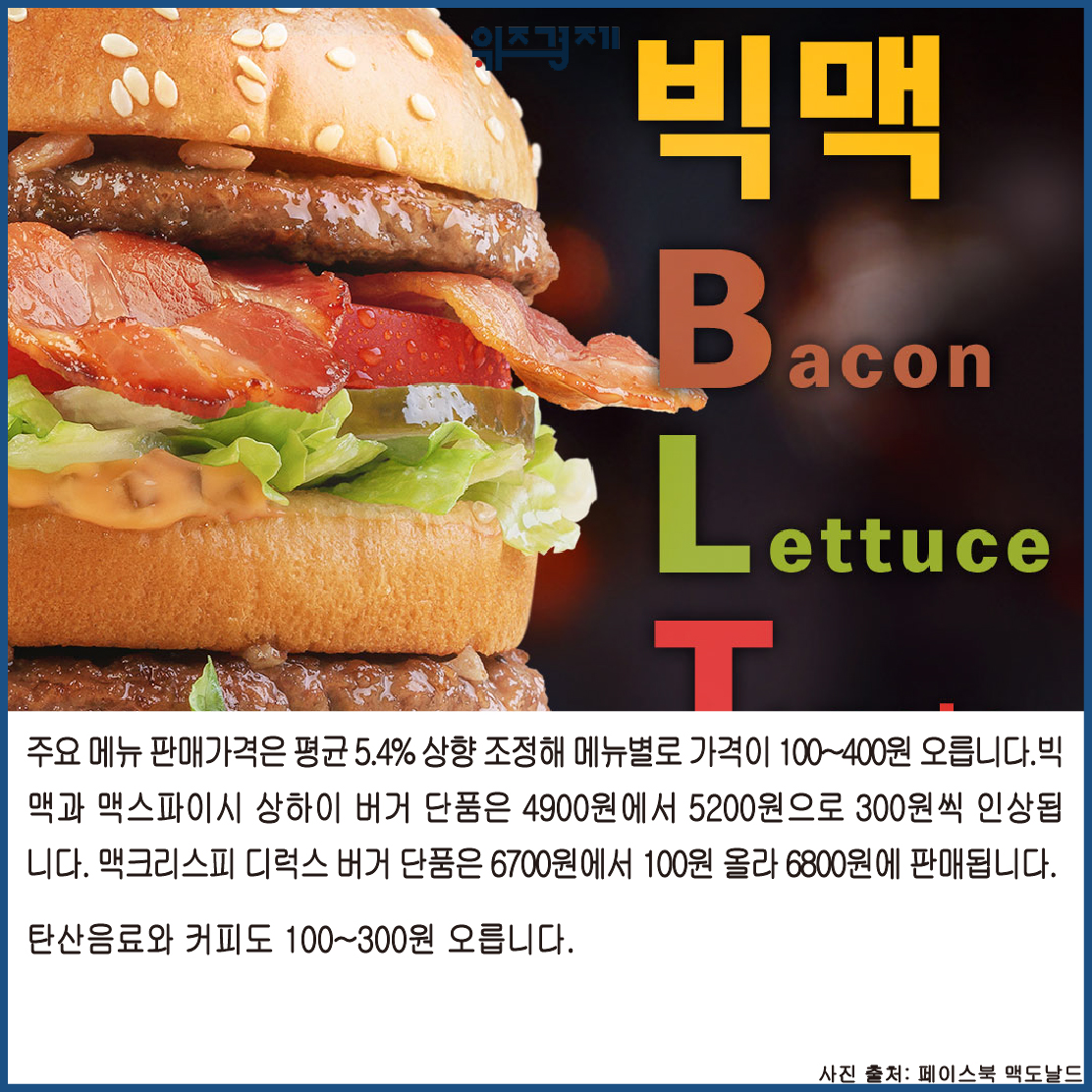 주요 메뉴 판매가격은 평균 5.4% 상향 조정해 메뉴별로 가격이 100~400원 오릅니다.빅맥과 맥스파이시 상하이 버거 단품은 4900원에서 5200원으로 300원씩