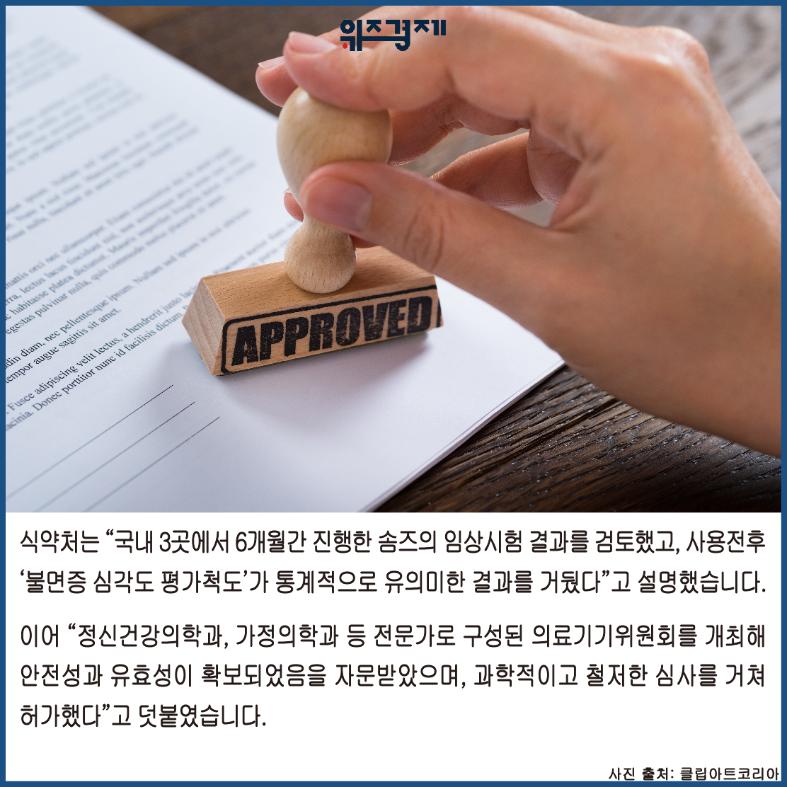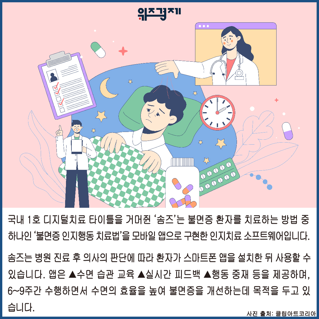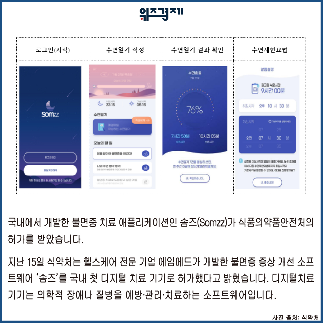 [위즈경제] 이정원 기자 =국내에서 개발한 불면증 치료 애플리케이션인 솜즈(Somzz)가 식품의약품안전처의 허가를 받았습니다.