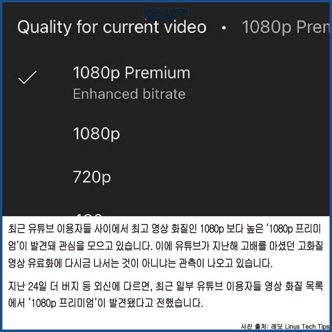 지난 24일 더 버지 등 외신에 다르면, 최근 일부 유튜브 이용자들 영상 화질 목록에서 ‘1080p 프리미엄’이 발견됐다고 전했습니다.
