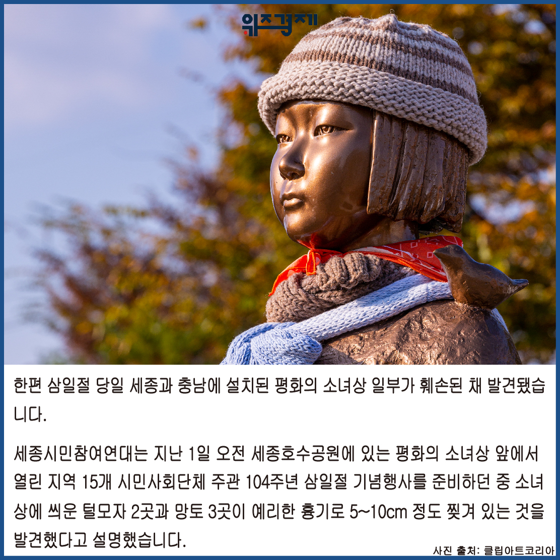 기념행사를 준비하던 중 소녀상에 씌운 털모자 2곳과 망토 3곳이