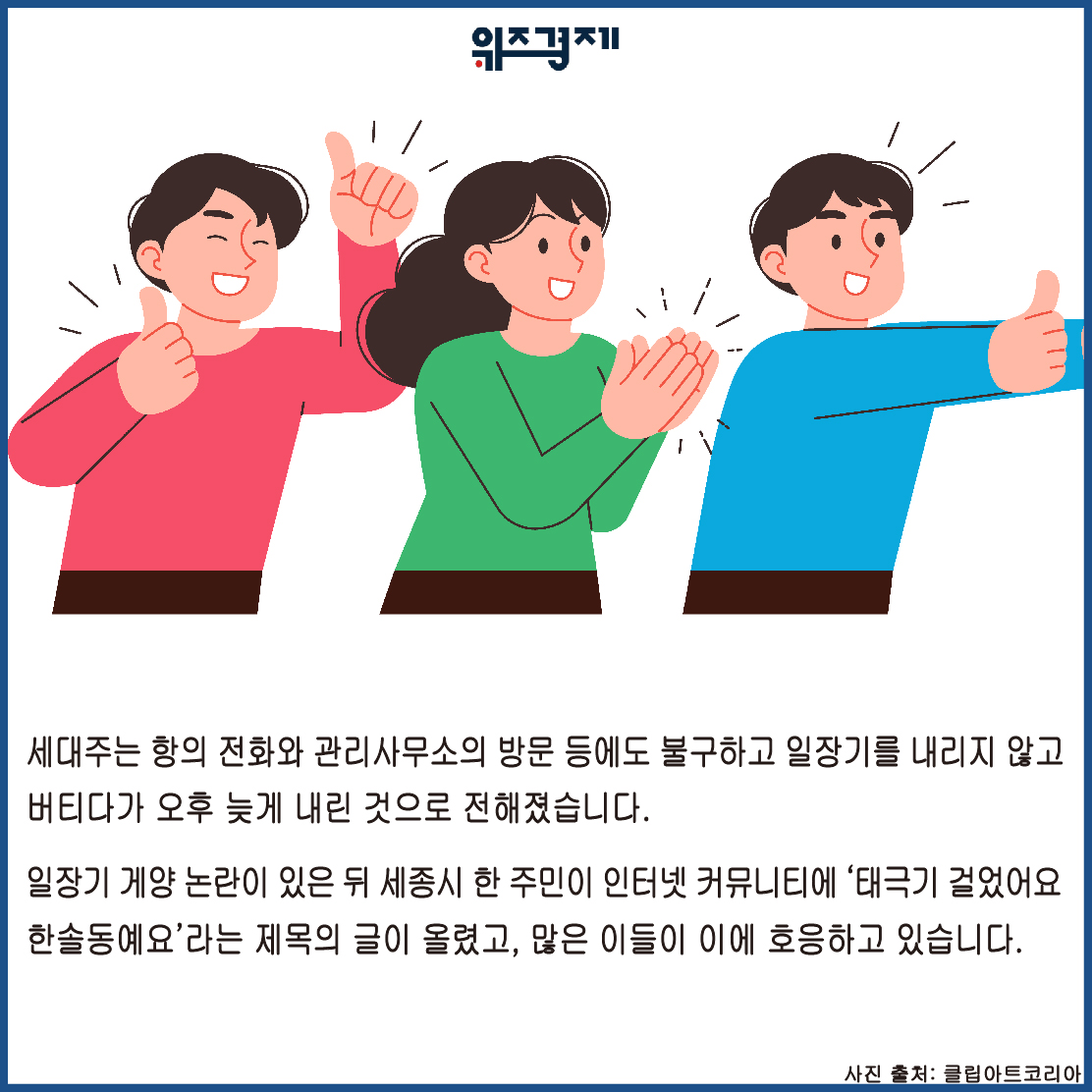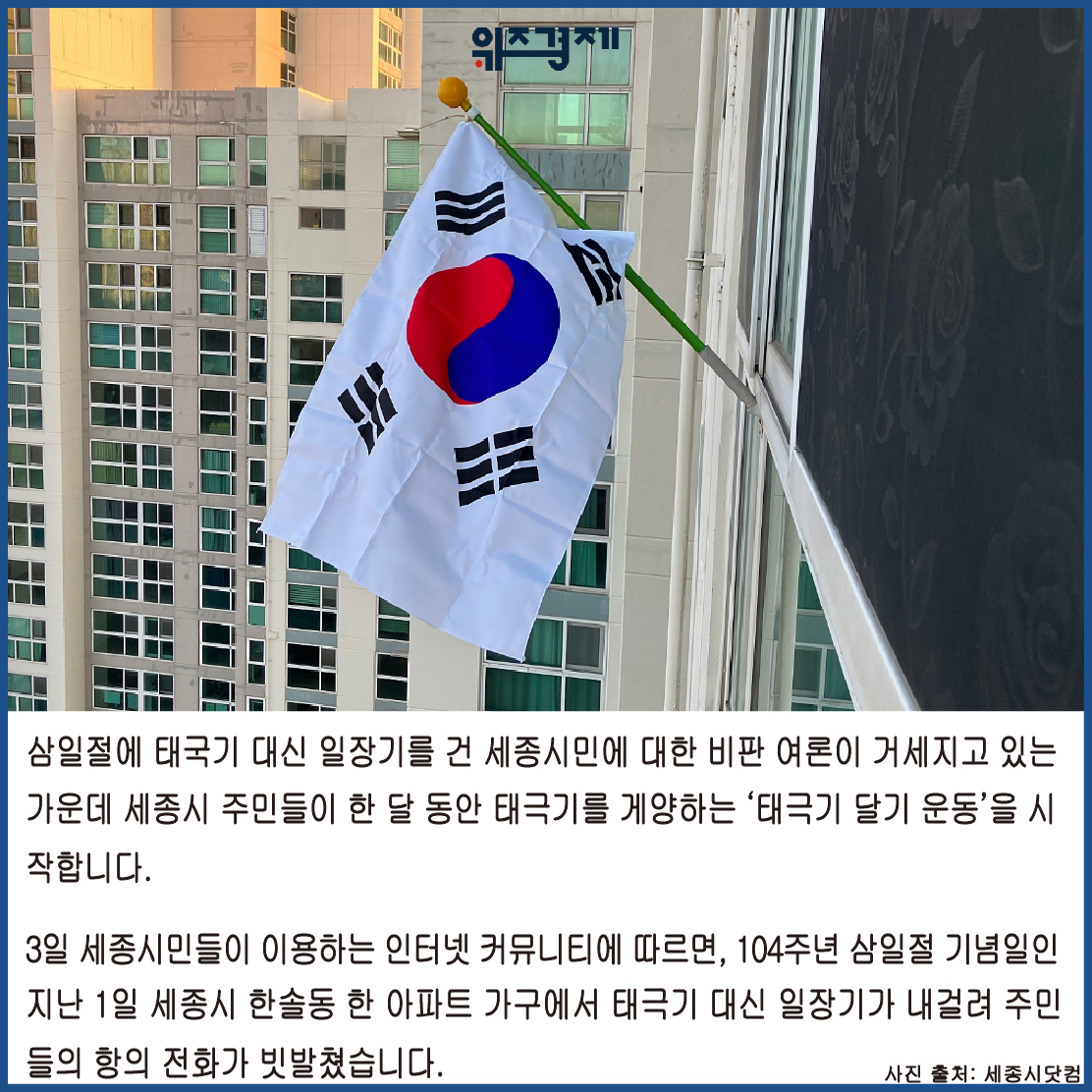 [위즈경제] 이정원 기자 =삼일절에 태국기 대신 일장기를 건 세종시민에 대한 비판 여론이 거세지고 있는 가운데 세종시 주민들이 한 달 동안 태극기를 게양하는 ‘태극기 달기 운동’을 시작합니다.