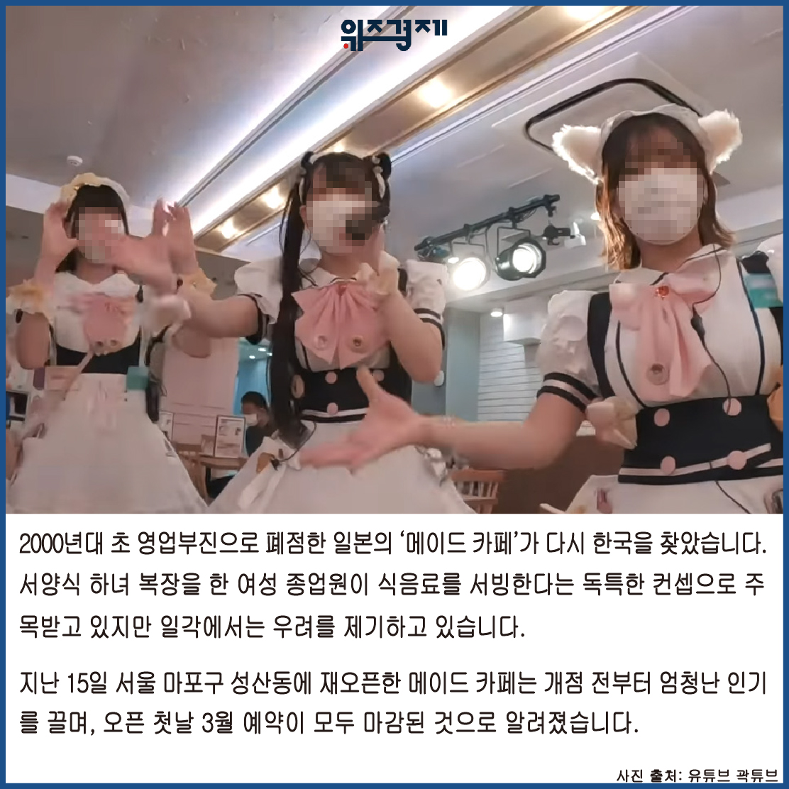 [위즈경제] 이정원 기자 =2000년대 초 영업부진으로 폐점한 일본의 ‘메이드 카페’가 다시 한국을 찾았습니다. 서양식 하녀 복장을 한 여성 종업원이 식음료를 서빙한다는 독특한 컨셉으로 주목받고 있지만 일각에서는 우려를 제기하고 있습니다.