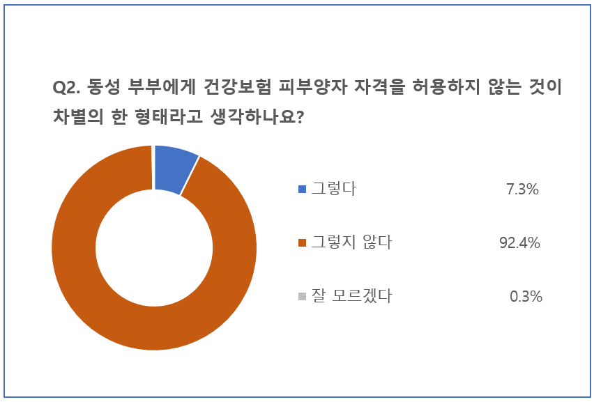 두 번째로, ‘동성부부에게 건강보험 피부양자 자격을 허용하지 않는 것이 차별의 한 형태라고 생각하나요?’라 묻자 참여자의 92.42%(488명)은 ‘그렇지 않다’고 이야기했습니다. ‘그렇다’고 응답한 참여자는 7.39%(39명), ‘잘 모르겠다’는 참여자는 2명(0.38%)입니다.