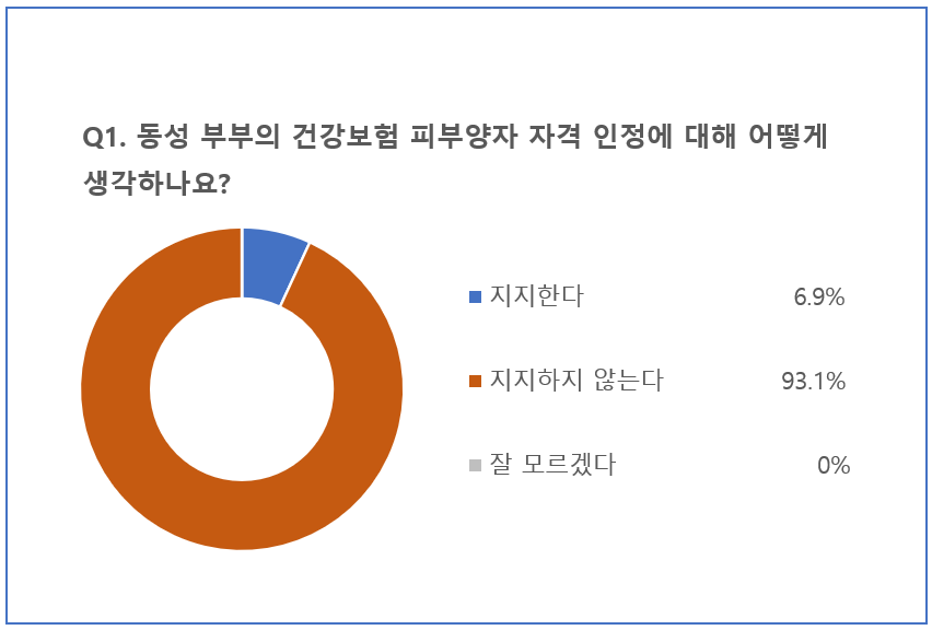‘지지한다’(동성부부라는 이유로 이성 부부와 차별하여 피부양자 자격을 박탈하는 것은 평등 원칙에 위배된다)고 응답한 참여자는 6.99%(37명)에 불과했으며, ‘잘 모르겠다’고 응답한 참여자는 아무도 없었습니다.