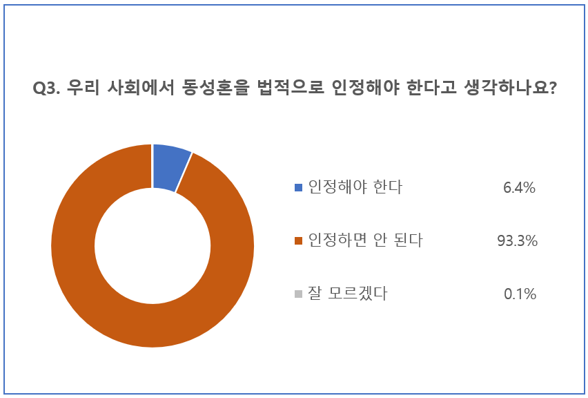 마지막으로 ‘우리 사회에서 동성혼을 법적으로 인정해야 한다고 생각하나요?’란 질문에는 참여자의 93.33%(490명)이 성적 문란과 가족제도의 파괴가 심화될 것이란 이유로 ‘인정하면 안 된다’고 전했습니다.