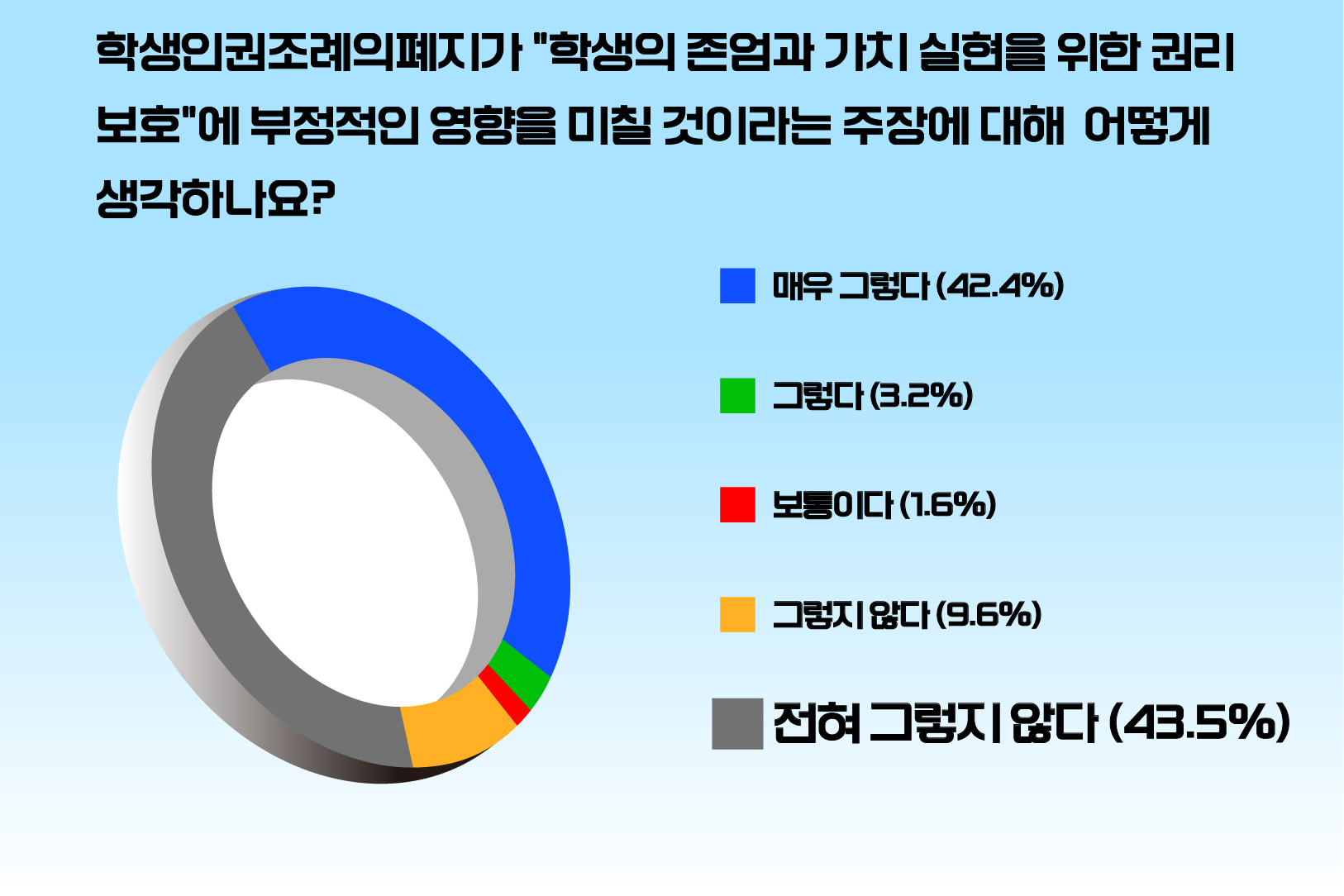 세번째로 ‘학생인권조례의 폐지가 학생의 존엄과 가치 실현을 위한 권리 보호에 부정적인 영향을 미칠 것이라는 주장에 대해 어떻게 생각하나요?’라는 질문에는 참여자의 43.5%가 ‘전혀 그렇지 않다’고 응답했습니다. ‘그렇지 않다’는 9.6%, ‘매우 그렇다’는 42.4%, ‘그렇다’는 3.2%, ‘보통이다’는 1.6%를 각각 기록했습니다.