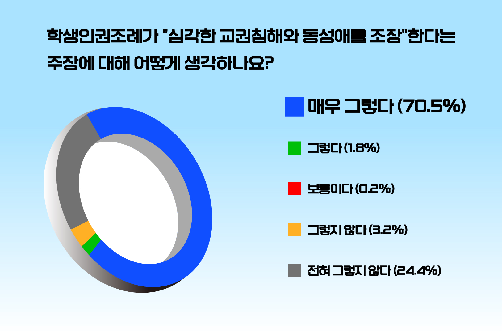 다음으로 ‘학생인권 조례가 심각한 교권침해와 동성애를 조장한다는 주장에 대해 어떻게 생각하나요’라는 질문에는 ‘매우 그렇다’고 응답한 비율이 70.5%를 차지했습니다. ‘그렇다’는 1.8%, ‘전혀 그렇지 않다’는 24.4%, ‘그렇지 않다’는 3.2%, ‘보통이다’는 3.2%를 각각 기록했습니다.