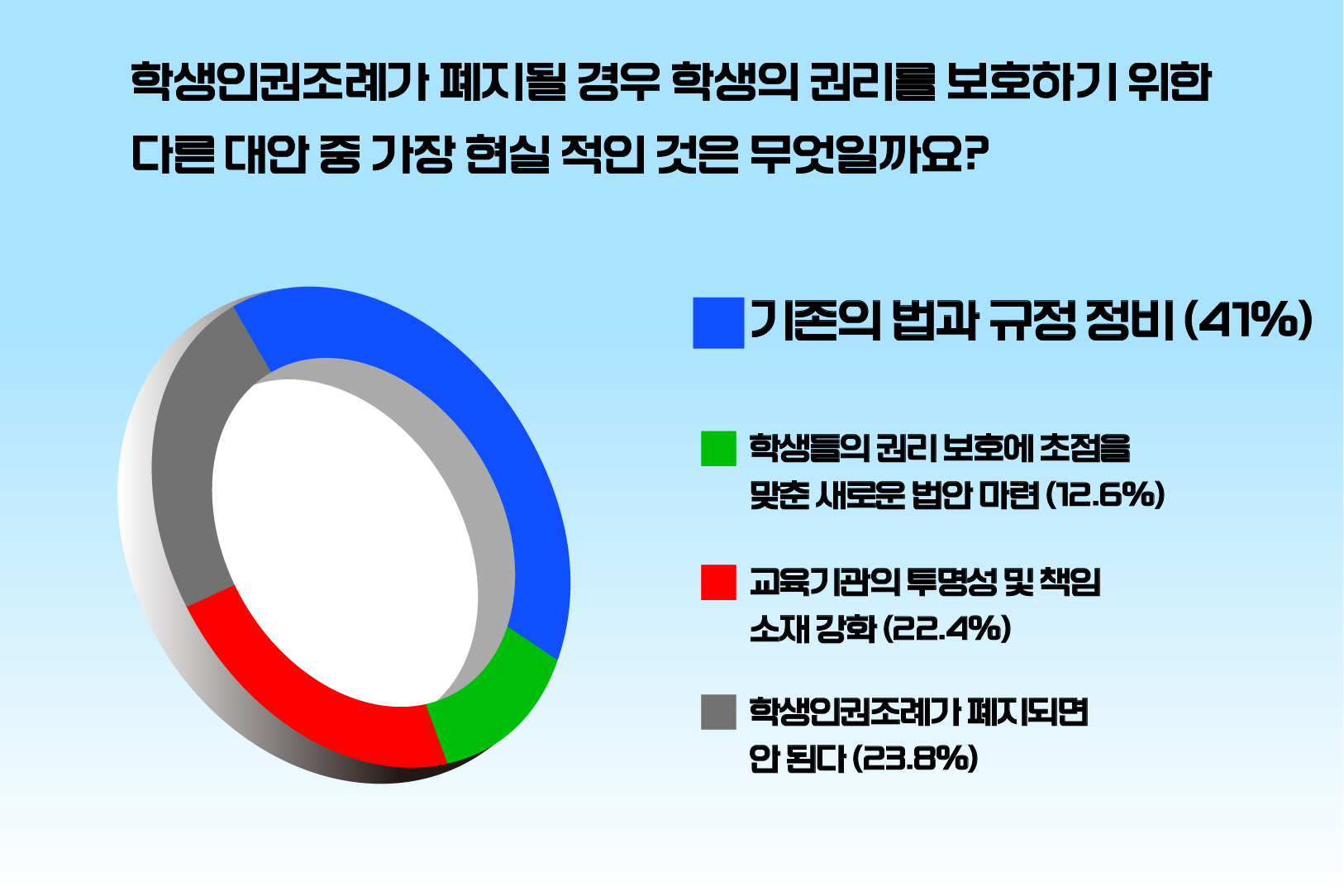 민주주의에서 인권은 가장 중요한 가치중에 하나입니다. 특히 학교라는 특수한 사회집단에서 교사라는 지위를 이용해 폭언과 폭력, 인권모독 등을 통해 학생의 인권을 짓밟는 상황으로부터 학생의 인권은 보호돼야 함은 분명합니다. 하지만 투표 결과에서 볼 수 있듯이 학생의 권리를 보호하기 위해서는 ‘기존의 법과 규정을 수정 보완’하거나, ‘교육기관의 투명성 및 책임소재를 강화’하는 것으로도 학생인권조례를 대신할 충분한 대안이 될 수 있을 것입니다.