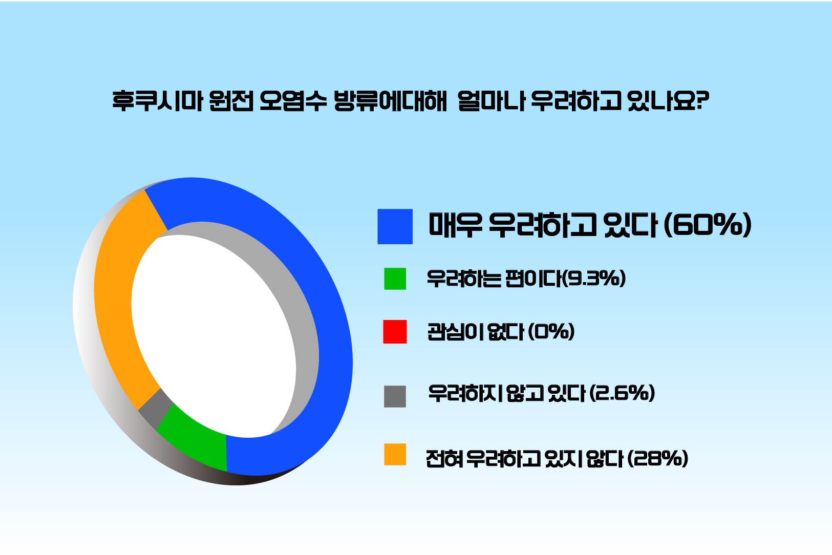 먼저 '후쿠시마 원전 오염수 방류에 대해 얼마나 우려하고 있나요?'라는 질문에는 '매우 우려하고 있다'고 응답한 비율이 60%를 차지했습니다. '우려하는 편이다' 9.3%, '우려하지 않고 있다' 2.6%, '전혀 우려하고 있지 않다'는 28%를 각각 기록했습니다.