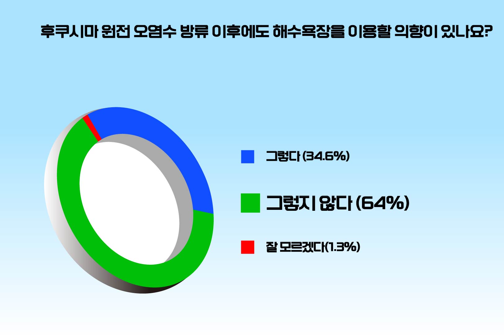 세번째로 ‘후쿠시마 원전 오염수 방류 이후에도 해수욕장을 이용할 의향이 있나요?라는 질문에는 '그렇지 않다(체내에 부정적 영향을 미칠 것이다)가 64%를 기록했습니다. 이어 '그렇다(해수욕 등은 체내에 미칠 염려가 없다)', '잘 모르겠다'가 각각 34.6%, 1.3%를 차지했습니다.