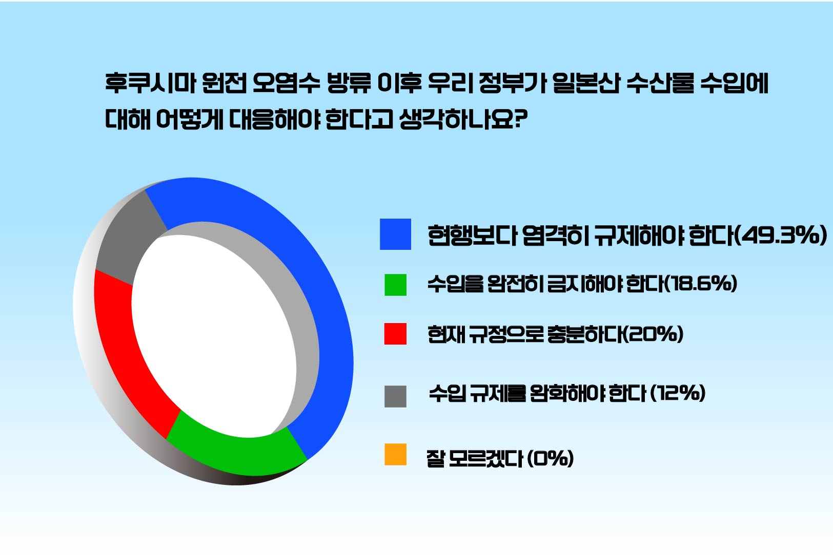 마지막으로 '후쿠시마 원전 오염수 방류 이후 우리 정부가 일본산 수산물 수입에 대해 어떻게 대응해야 한다고 생각하나요?라는 질문에는 '현행보다 더 엄격하게 규제해야 한다'는 의견이 49.3%를 차지했습니다. 이어 '현행 규정으로 충분하다'(20%), '수입을 완전히 금지해야 한다'(18.6%), '수입 규제를 완화해야 한다'(12%) 순입니다.