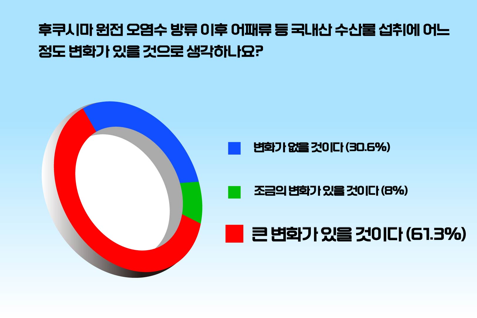 두번째로 '후쿠시마 원전 오염수 방류 이후 어패류 등 국내산 수산물 섭취에 어느정도 변화가 있을 것으로 생각하나요'라는 질문에는 61.3%가 '큰 변화가 있을 것이다'(일본산, 국내산 수산물 섭취 중단)고 답했습니다. 이어 '변화가 없을 것이다'(체내에 미칠 염려가 없다고 믿는다)는 30.6%, '조금의 변화가 있을 것이다'(섭취를 하되 횟수를 줄일 것이다)는 8%를 각각 기록했습니다.