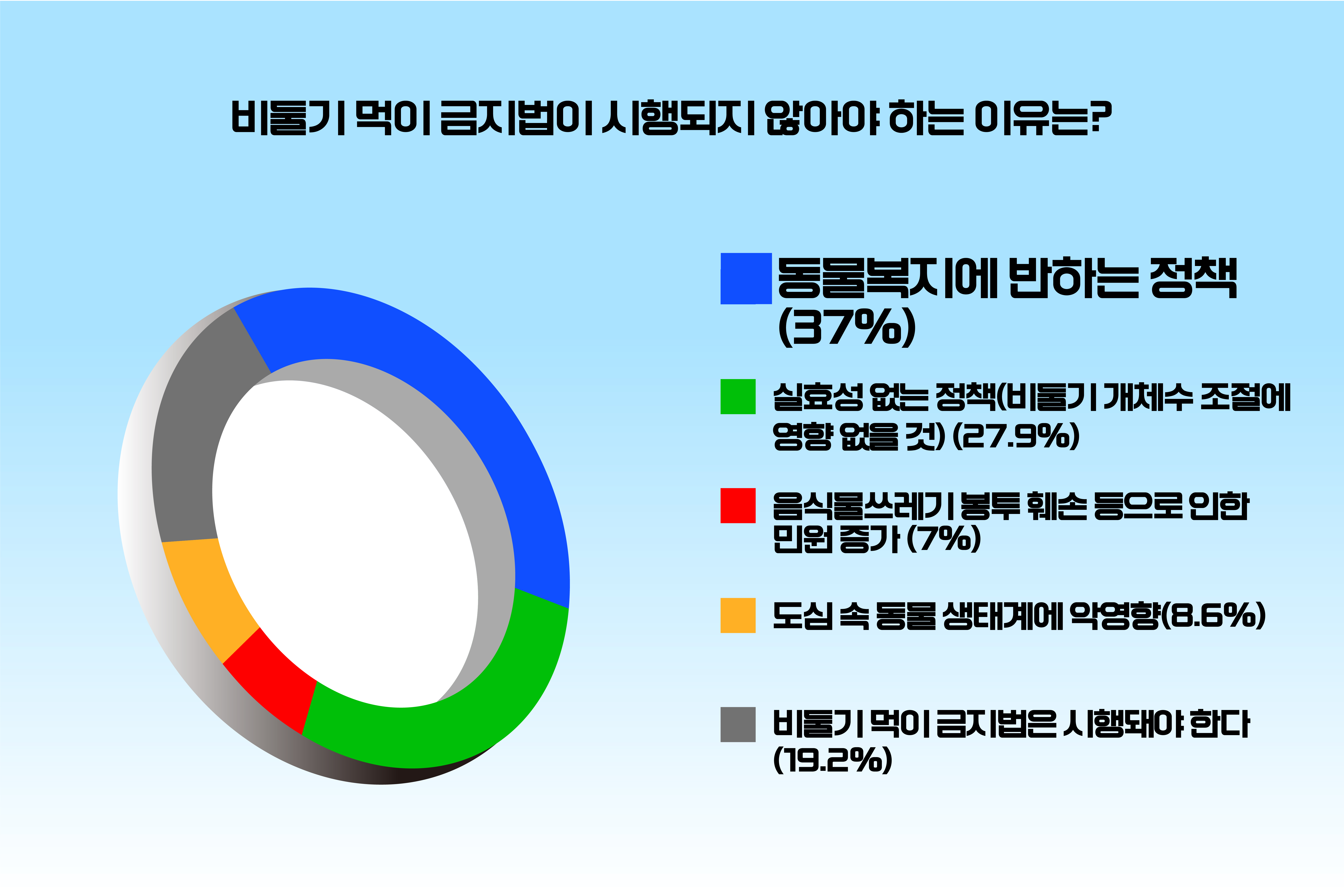 비둘기 먹이 금지법시행을 반대하는 이유로는 동물복지에 반하는 정책이라는 의견이 37%로 가장 많았으며, ‘실효성 없는 정책(비둘기 개체수 조절에 영향 없을 것) 27.9%’, ‘도심 속 동물 생태계에 악영향’ 8.6%, ‘음식물쓰레기 봉투 훼손 등으로 인한 민원 증가 7% 순으로 조사됐다.