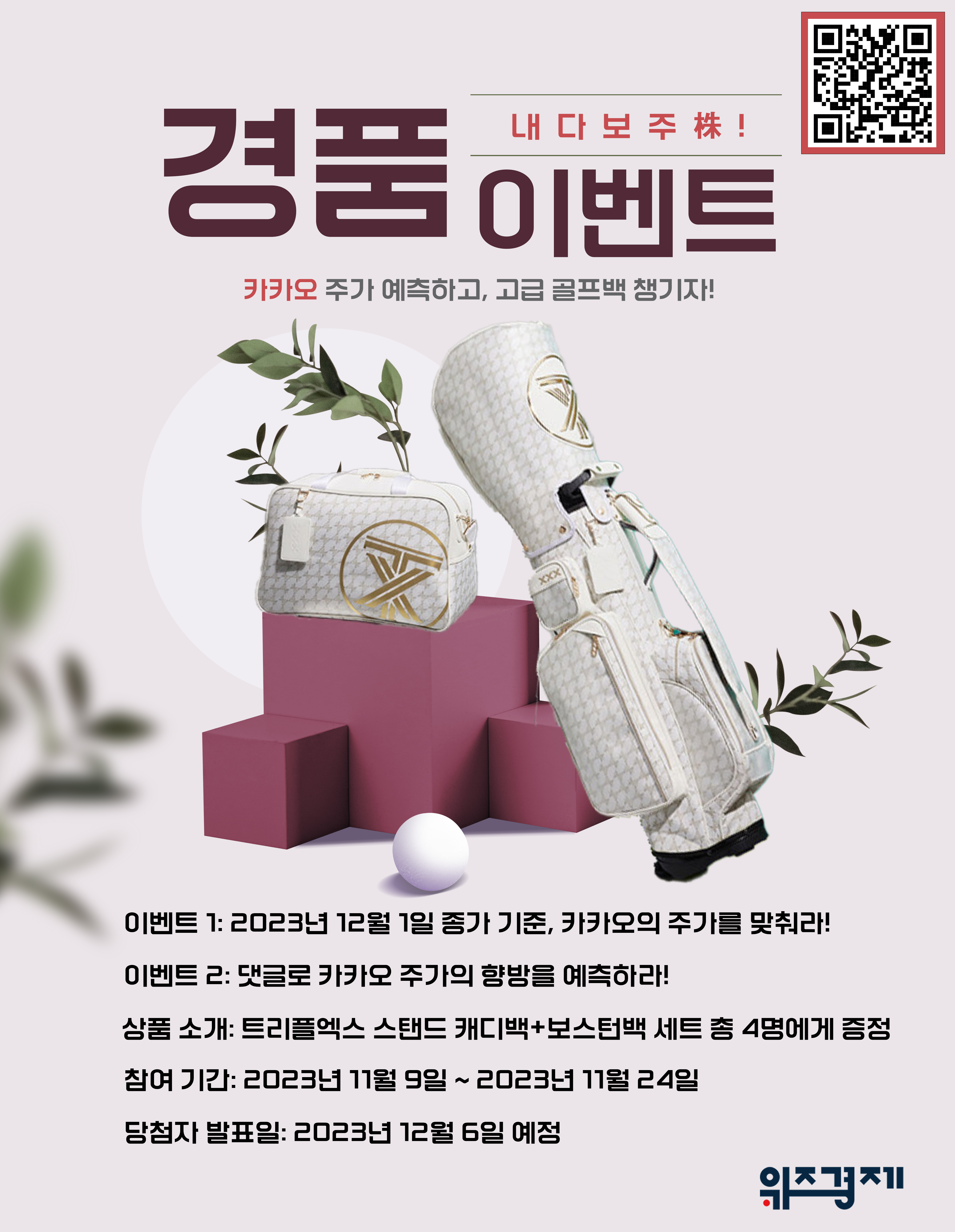 - 아울러, 11월 9일 카카오 주가(45,600원) 기준, 12월 1일 카카오 주가(종가)의 향방(상승 혹은 하락) 여부를 맞춘 댓글 중에서 가장 많은 추천을 받은 1명에게 ‘트리플엑스 스탠드 캐디백 + 보스턴백 세트’를 선물로 드립니다.