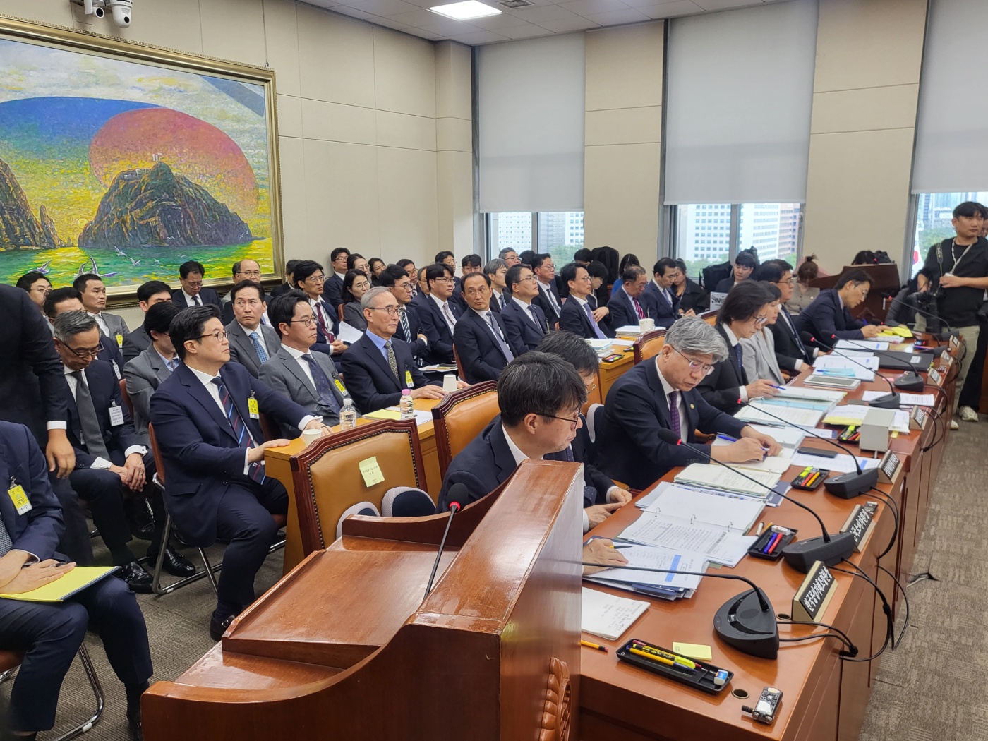 14일 서울 국회에서 열린 정무위원회 국정감사에서 증인들과 피감기관이 참석에 자리에 앉아 있다. 사진=위즈경제