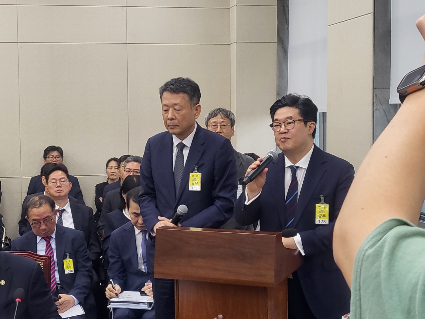 홈플러스의 대주주인 MBK파트너스의 김병주 회장(오른쪽)이 14일 정무위 국정감사에 참석해 질의에 답변하고 있다. 왼쪽은 홈플러스 대표이사를 겸직하고 있는 김광일 부회장.사진=위즈경제