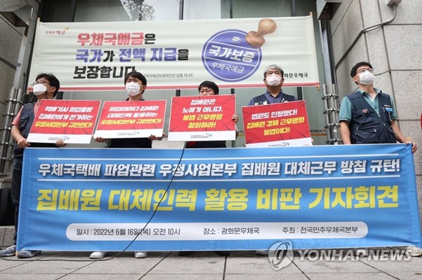 2022년 전국민주우체국본부는 서울 종로구 광화문우체국 앞에서 '집배원 대체인력 활용 비판 기자회견'을 열었다. (사진=연합뉴스)