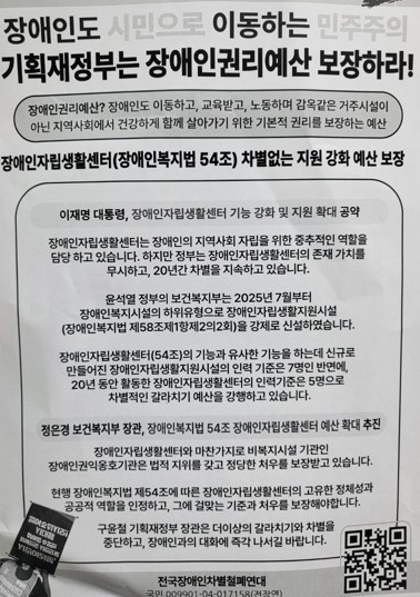 [위즈경제] 류으뜸 기자 =전국장애인차별철폐연대가 20일 오전 서울 지하철 2호선 안에서 출근길 지하철 탑승 시위를 하고 있다. 이날 단체 소속 활동가 중 한 명은 휠체어에서 내려 무릎은 꿇은 채 이재명 정부가 장애인 권리예산과 자립생활센터 지원 예산을 차별 없이 보장해야 한다고 요구했다. 이들은 요구사항이 적힌 현수막과 조끼를 입고 승객들에게 유인물을 나눠줬다.