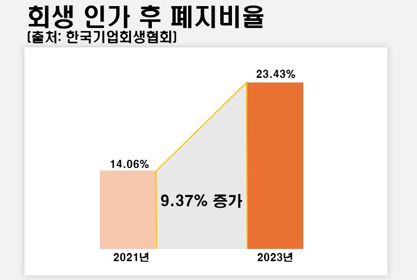 21일 한국기업회생협회가 대법원 사법통계(2020~2023년)를 정리한 자료에 따르면, 인가 후 폐지 비율은 2023년 24.43%를 기록했다. 회생 인가를 받은 4곳 중 1곳이 법원으로부터 회생폐지 수순을 밟고 있는 것이다. 최근 통계(2024~2025년)는 공개되지 않았지만 민간 연구기관을 중심으로 폐지된 기업 수가 늘었을 거란 전망이 나오고 있는 만큼 해당 비율은 더 상승했을 것으로 보인다.