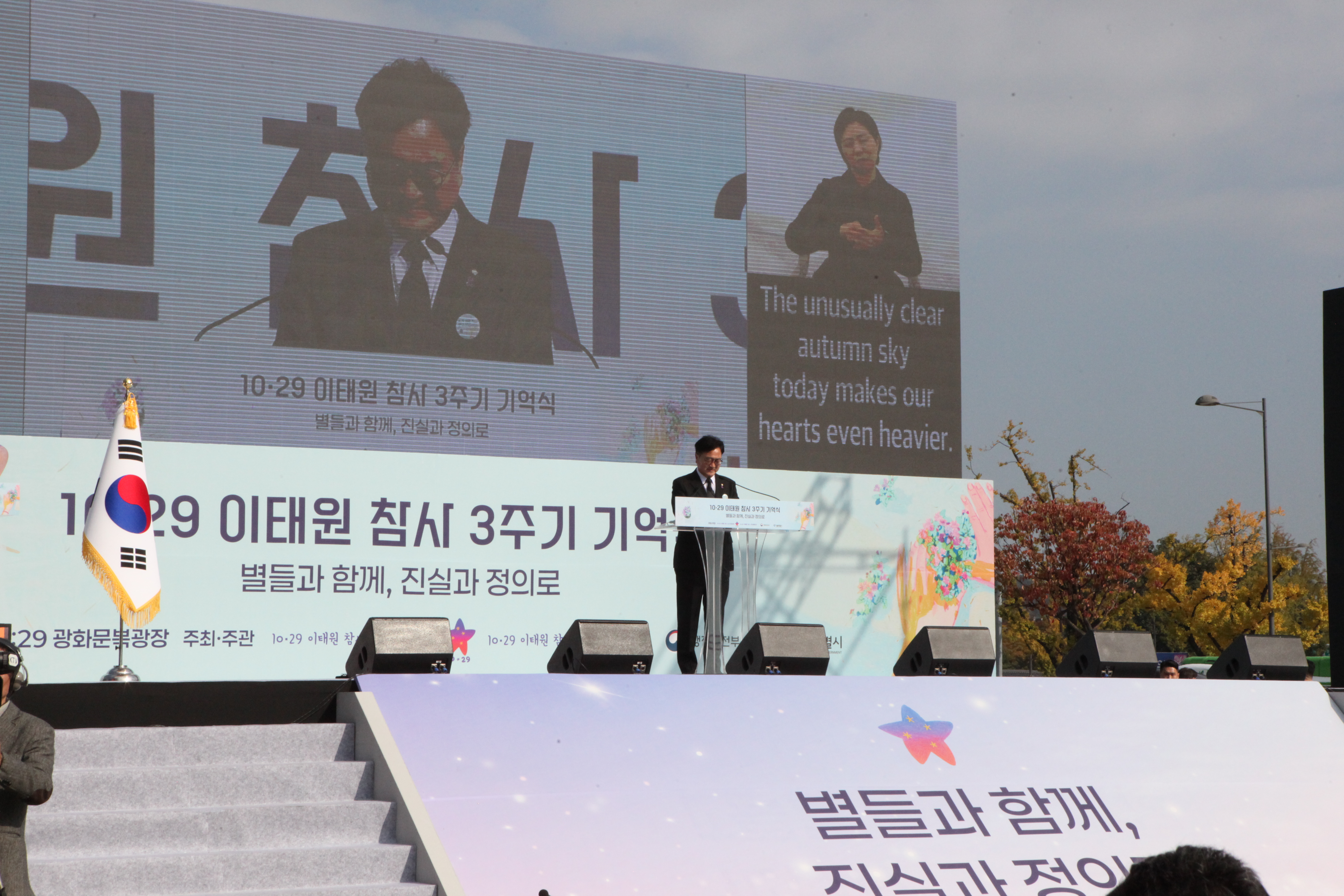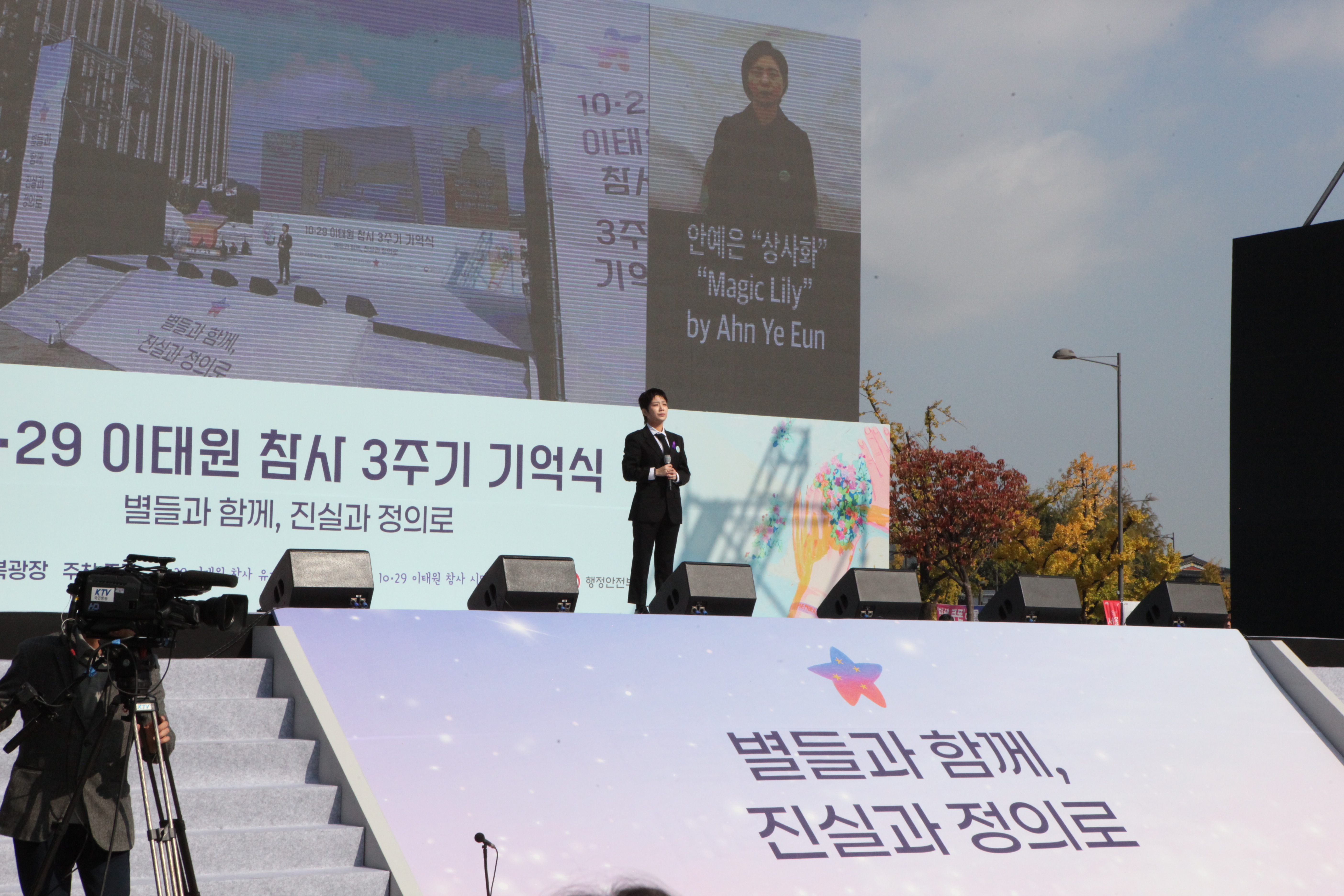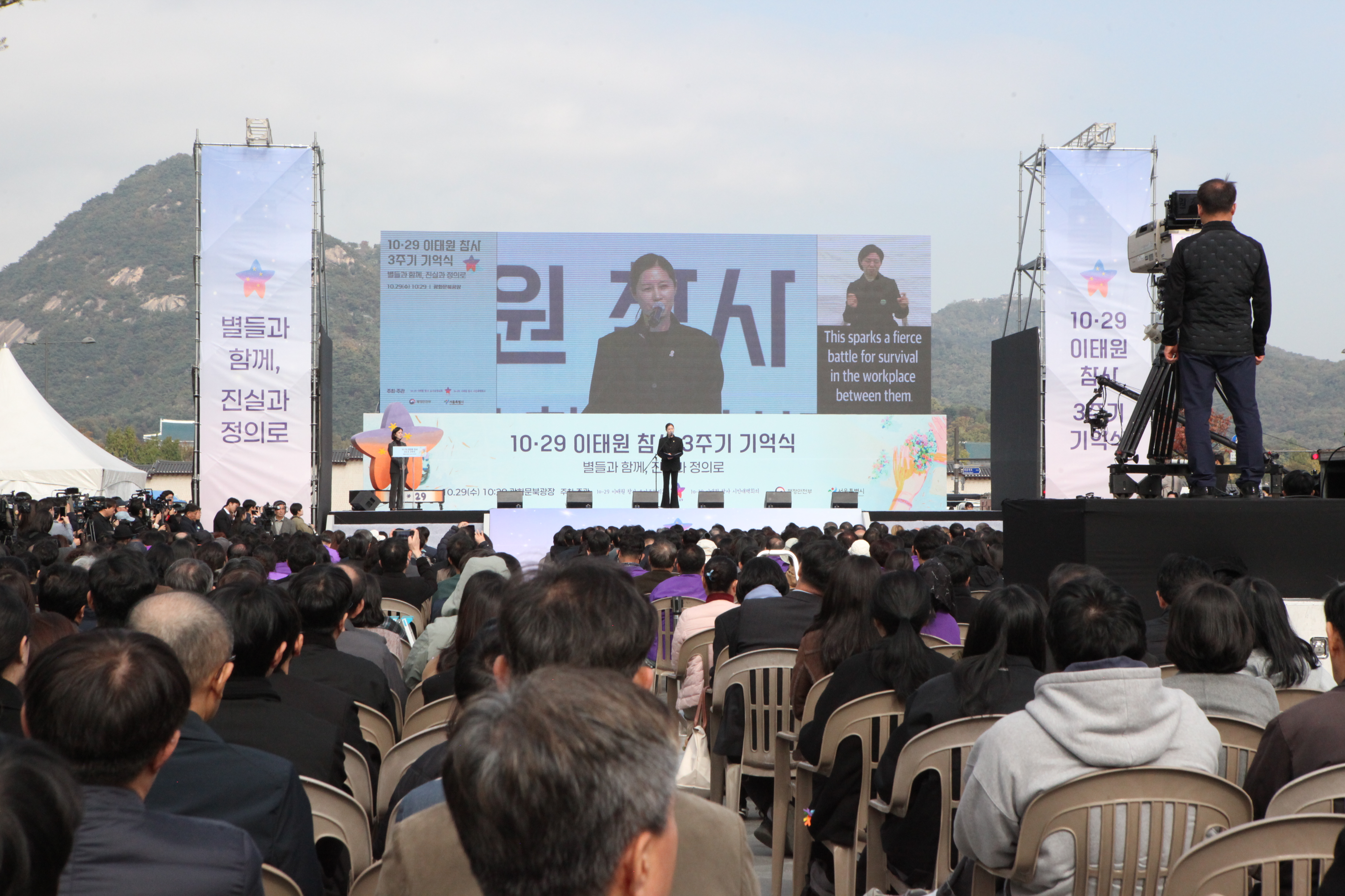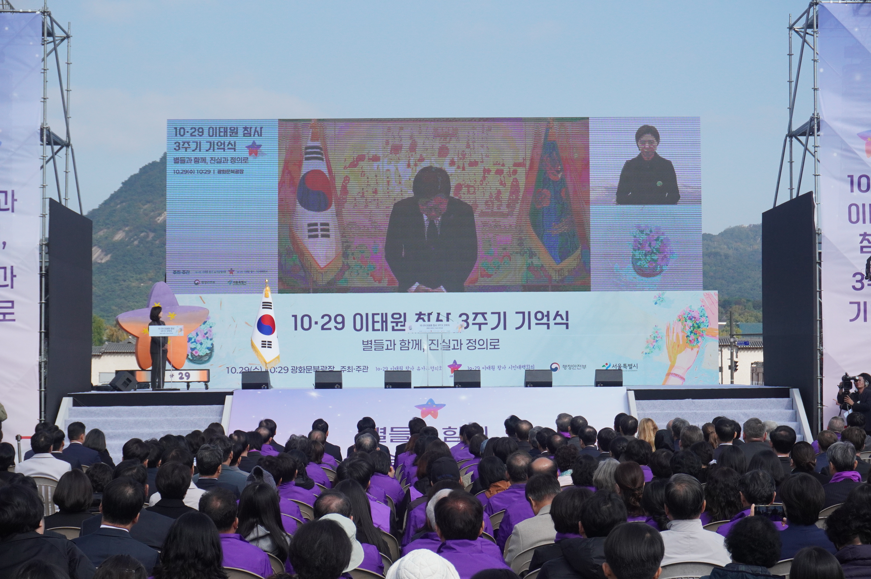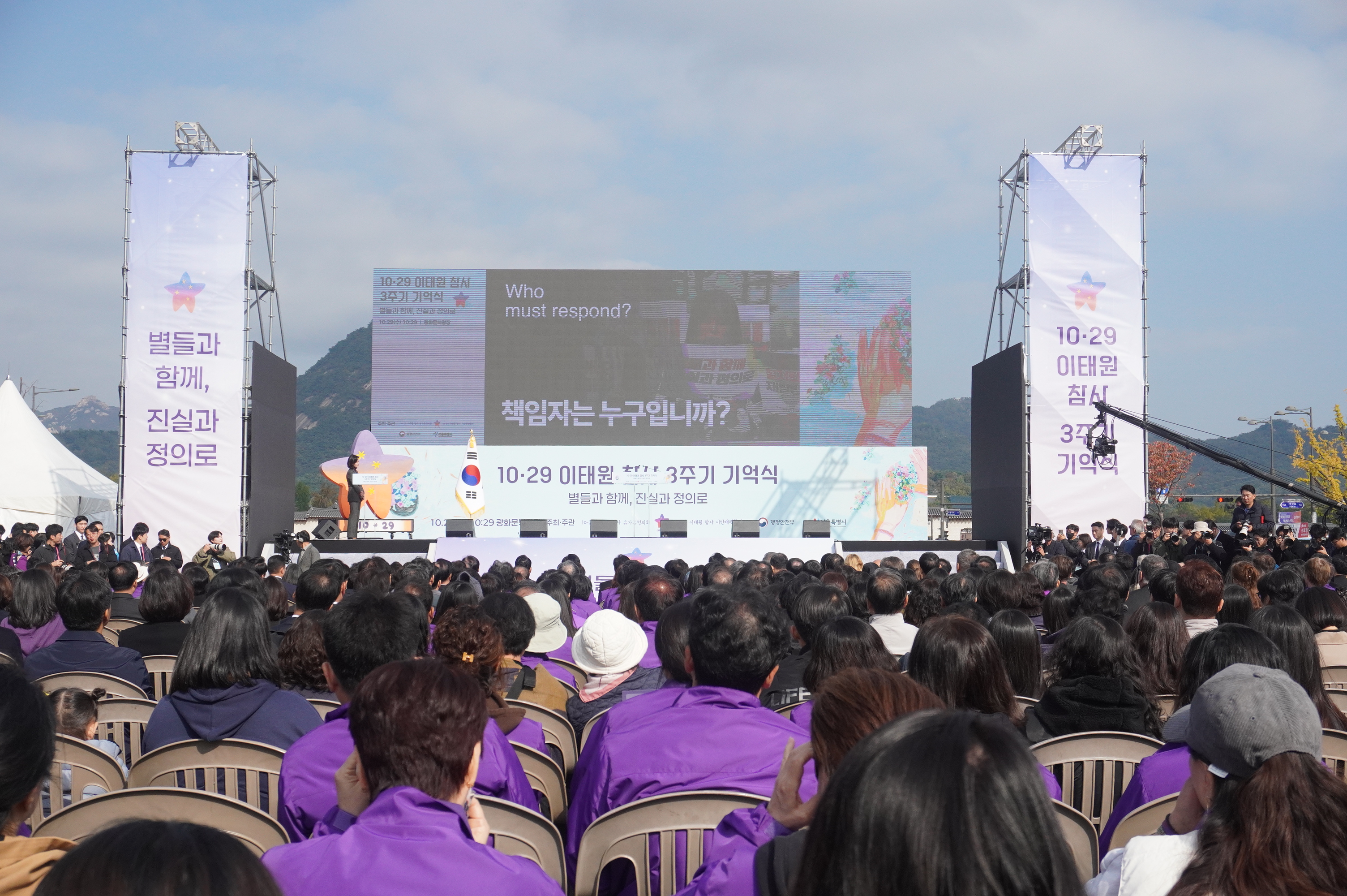 10.29 이태원 참사 유가족협의회와 시민대책회의, 서울시는 이날 광화문 북광장에서 ‘별들과 함께, 진실과 정의로’를 주제로 3주기 기억식을 개최했다. 이번 추모식은 이태원 참사 유가족, 시민단체, 정부가 공동으로 개최해 10.29 이태원 참사 희생자를 추모하고 유가족을 위로하는 첫번째 자리다.