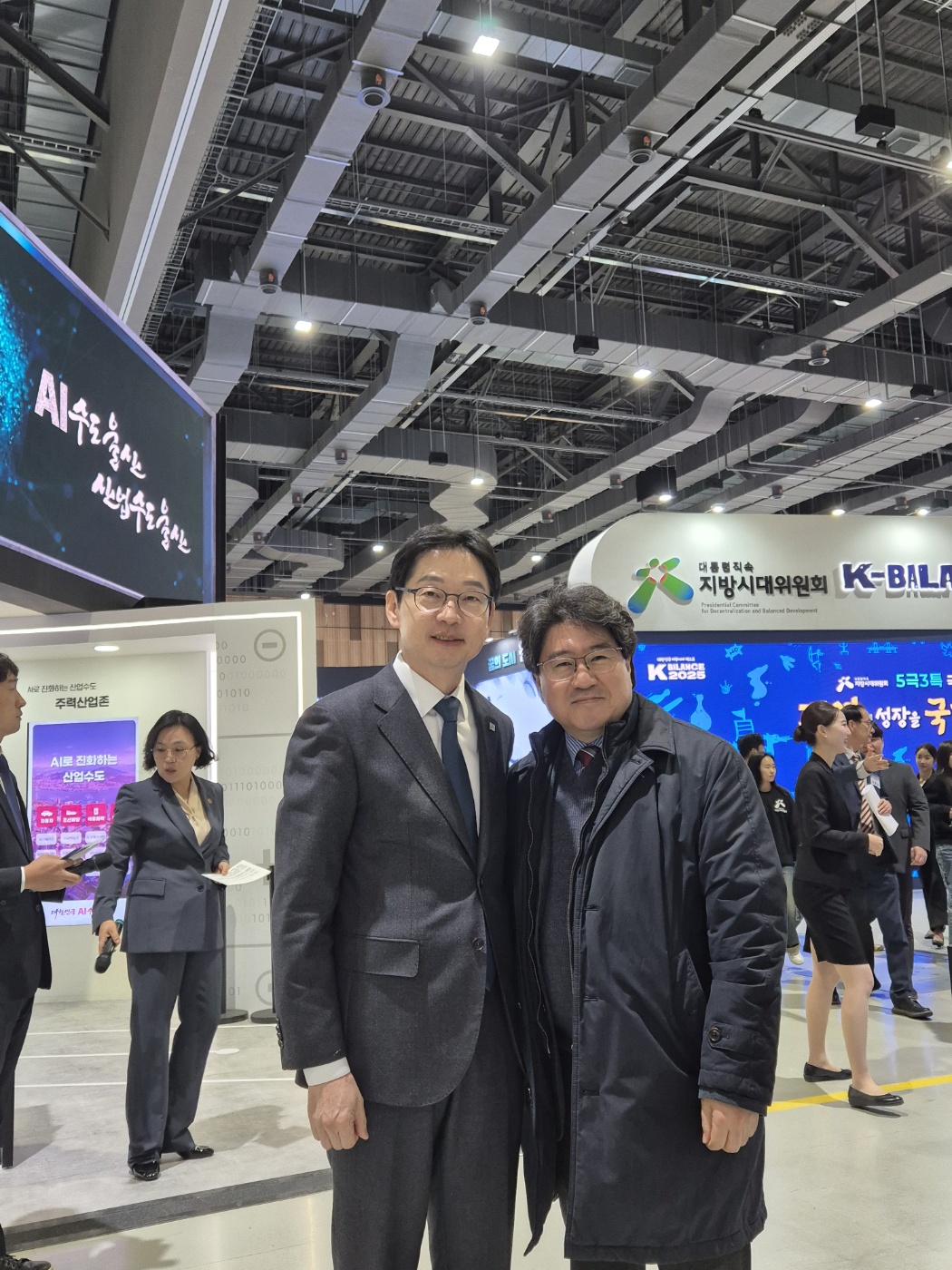 김경수 대통령직속지방시대위원회 위원장(왼쪽)과 윤병운 한국회생기업협회 회장(오른쪽)이 지난 19일 개막한 ‘2025 대한민국 지방시대 엑스포’ 행사장에서 기념촬영을 하고 있다.