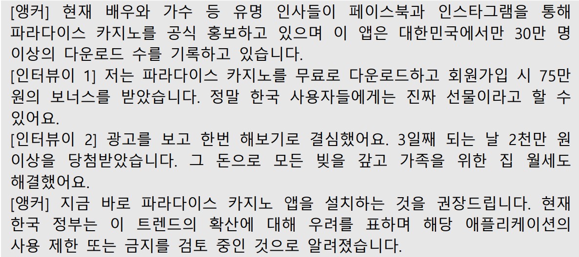 문제가 된 영상 가운데 일부는 실제 뉴스 프로그램과 거의 동일한 형식을 갖고 있다. 해당 영상은 AI가 합성한 앵커와 인터뷰이를 등장시키고, 마치 언론 보도가 진행되는 것처럼 화면을 구성해 도박 앱을 홍보한다. 영상에서는 유명 인사들이 해당 앱을 홍보하고 있다는 설명이 이어지고, 가입만 해도 보너스를 받았다는 인터뷰와 단기간 고액 당첨을 경험했다는 듯한 발언이 포함돼 있다. 정부가 해당 애플리케이션에 대한 규제를 검토 중이라는 멘트까지 더해져 있었으나, 이는 모두 사실과 다른 조작된 내용이었다.