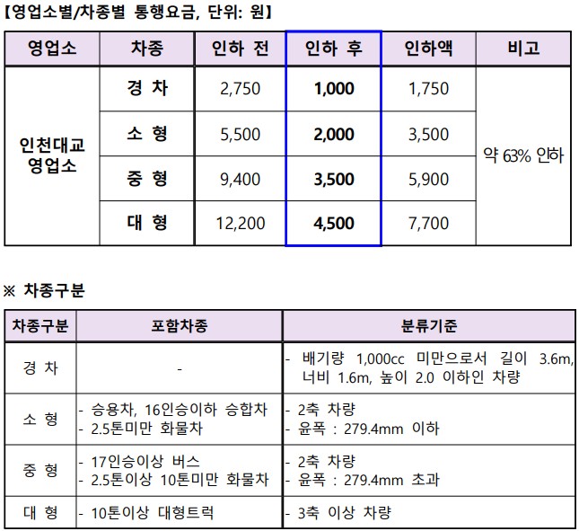 국토교통부는 국민의 통행료 부담을 줄이기 위해 인천대교 사업시행자와 통행료 인하를 골자로 한 변경 실시협약을 체결했다고 16일 밝혔다. 이번 조치로 경차는 2,750원에서 1,000원으로, 중형차는 9,400원에서 3,500원으로, 대형차는 12,200원에서 4,500원으로 각각 인하된다.