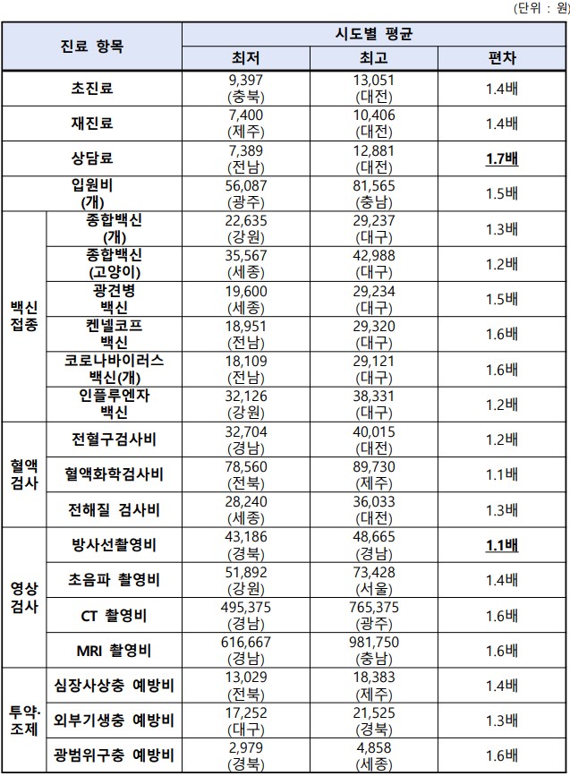 지역별 평균 진료비 편차도 공개됐다. 시·도 단위 기준으로 볼 때 항목별 지역 격차는 최소 1.1배에서 최대 1.7배 수준이었다. 상담료의 경우 대전이 가장 높고 전남이 가장 낮아 1.7배 차이를 보였으며, CT와 MRI 촬영비 역시 지역에 따라 최대 1.6배의 격차가 나타났다.