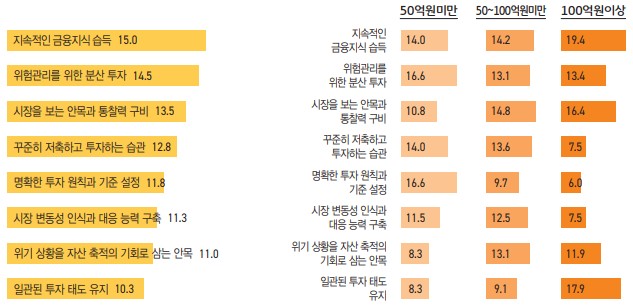 보고서에 따르면 한국 부자들이 꼽은 성공적인 자산관리를 위한 지혜 1순위는 ‘지속적인 금융 지식 습득’이었다. 자산 규모가 커질수록, 그리고 시간이 흐를수록 이 응답 비중은 더욱 높아졌다. 이는 부의 조건이 단순히 돈의 많고 적음이 아니라, 그 돈을 다루는 능력에 있음을 상징적으로 보여준다.