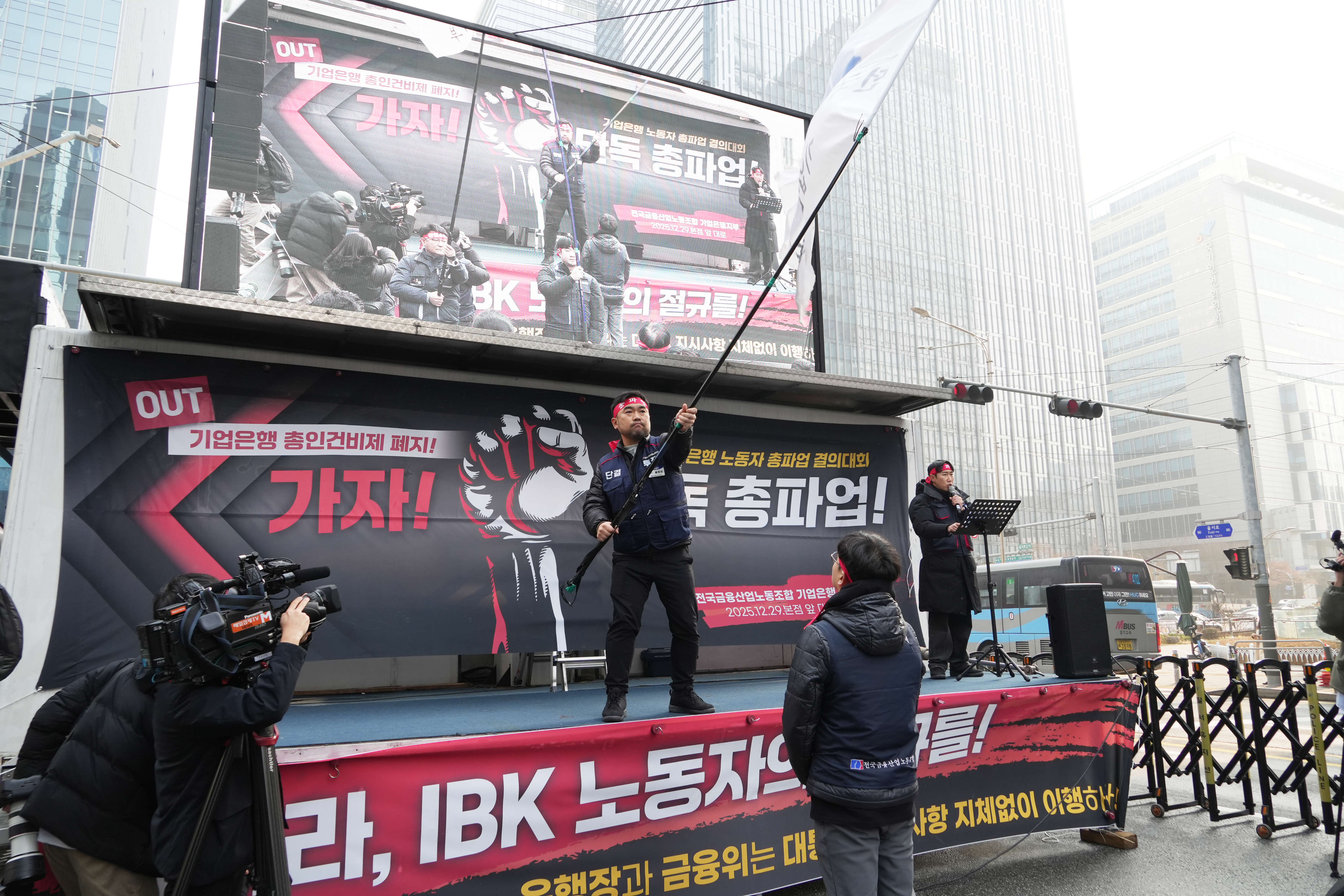 29일 본점앞대로에서 열린 결의대회에는 김동명 한국노총위원장, 김형선 금융노조위원장, 박홍배 민주당국회의원을 비롯해 기업은행노조조합원 천여명이 참석해 금융위를 규탄하고 투쟁을 다짐했다.