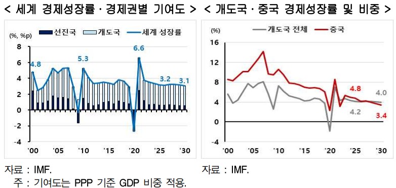 세계 경제 성장률은 장기적으로 하락 추세를 보이고 있다. 선진국은 이미 구조적 저성장 국면에 진입했고, 개도국 역시 과거와 같은 고성장을 기대하기 어려운 상황이다. 보고서에 따르면 글로벌 평균 성장률은 팬데믹 이후 일시적으로 반등했지만, 중장기적으로는 다시 둔화 국면에 접어들 가능성이 크다.