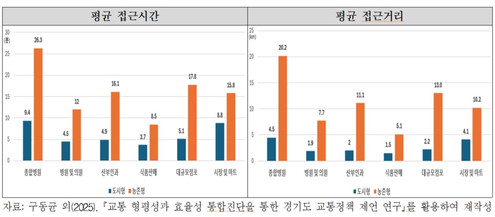 보고서는 단순한 시설 수 부족을 넘어, 실제 주민들이 감내해야 하는 이동 부담이 삶의 질을 직접적으로 훼손하고 있다고 지적한다. 농촌 주민이 종합병원 한 곳을 이용하기 위해 이동해야 하는 면적은 도시의 약 11배, 대형마트 등 대규모 점포는 13배에 달한다. 이동 시간은 도시보다 2~3배, 이동 거리는 최대 6배 이상 길다.