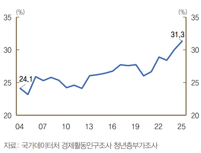 핵심 지표는 단순하다. 첫 취업까지 걸리는 기간이 1년 이상인 비중이 2004년 24.1%에서 2025년 31.3%로 상승했다. “취업 준비가 길어졌다”는 말이 감상이나 체감이 아니라, 장기 시계열에서 확인되는 변화임을 보여준다.