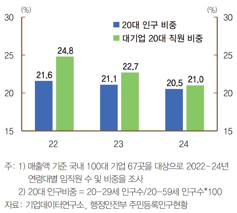 셋째는 양질의 일자리 공급 자체가 줄거나, 청년 몫이 축소되는 흐름이다. 보고서는 대기업 20대 직원 비중이 2022년 24.8%에서 2024년 21.0%로 감소했다고 제시한다. 청년 인구 비중도 줄고 있지만, 대기업 내부에서 청년 비중이 더 빠르게 줄어든다면 “문이 좁아지는 속도”가 “대기열이 줄어드는 속도”보다 빠를 수 있다. 청년이 더 오래 준비해도 들어갈 자리가 함께 늘지 않는 구조다.