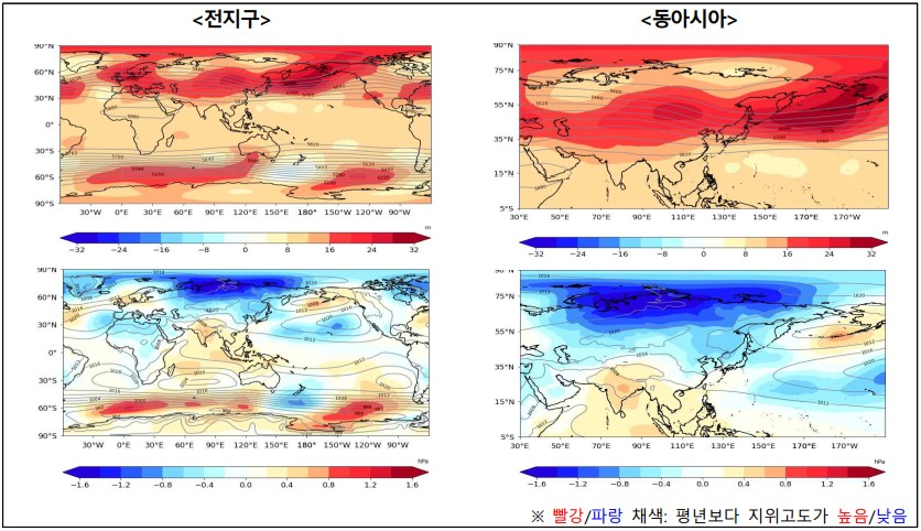 (상) 500hPa(약 5.5km 상공) 및 (하) 해면기압 지위고도 편차(hPa)(이미지=기상청)