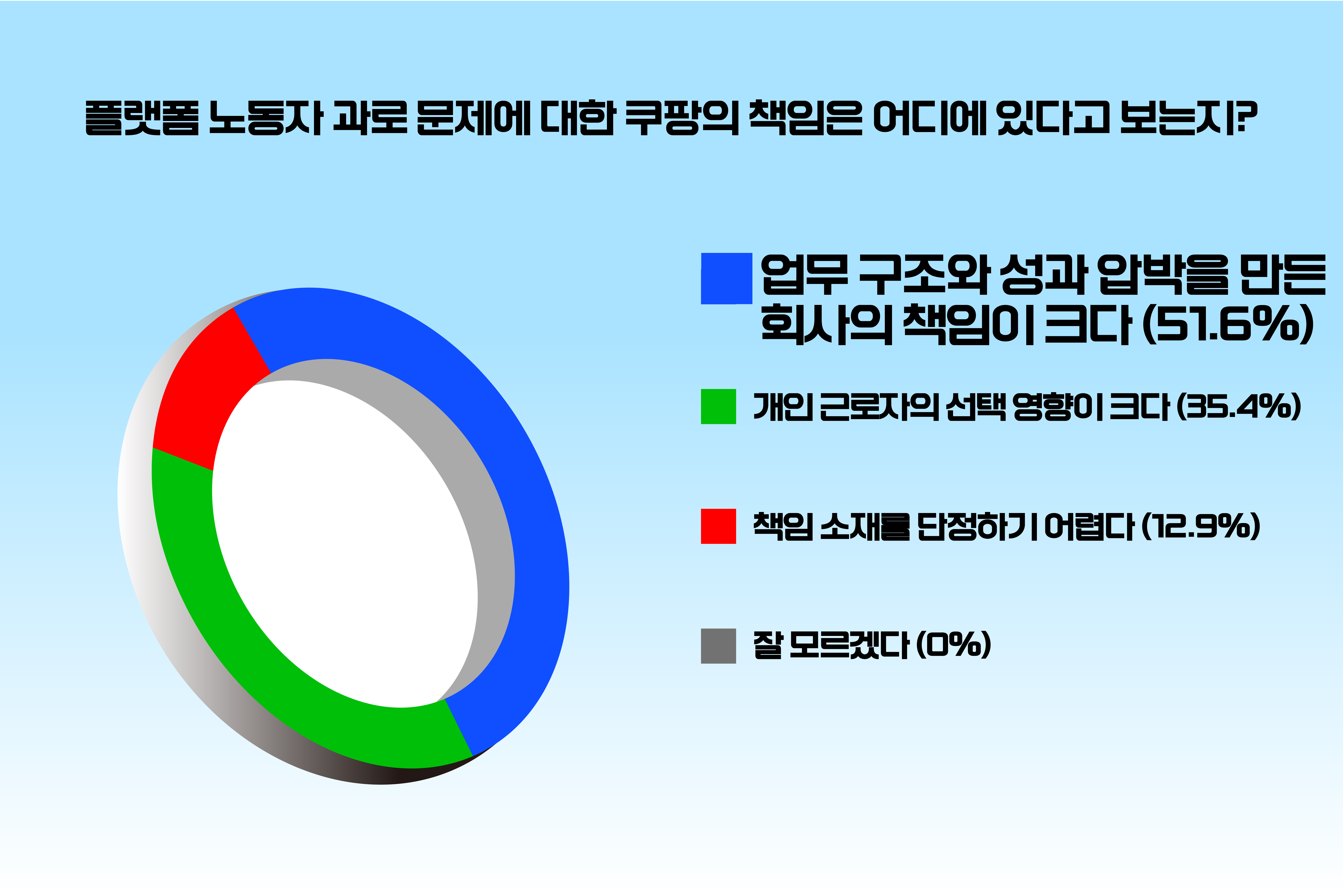 아울러 노동자 과로 문제에 대해 업무 구조와 성과 압박을 초래한 쿠팡의 책임이 있다고 응답한 비율이 절반 이상인 51.6%로 나타났다.