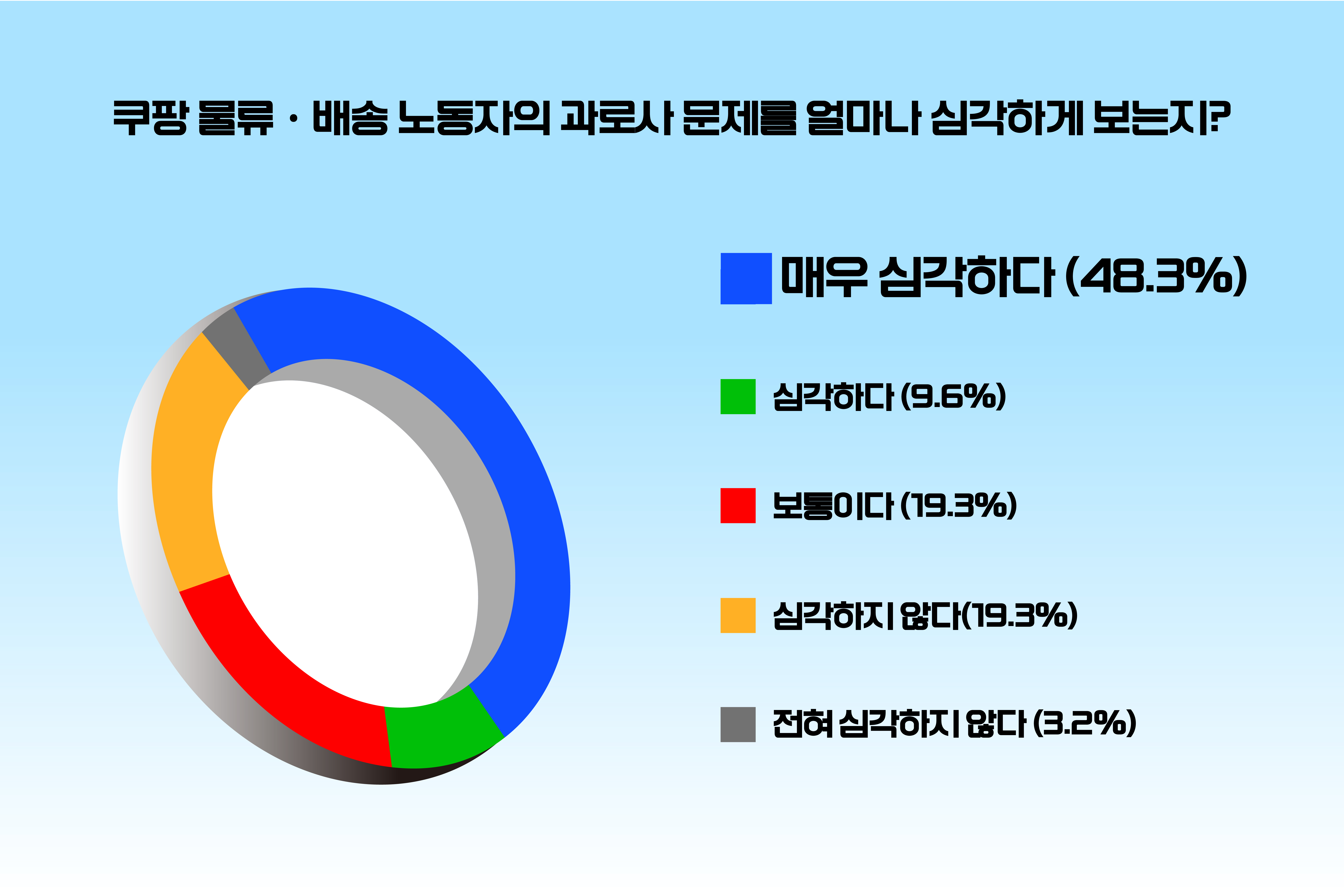 우선, '쿠팡 물류·배송' 노동자의 과로사 문제 심각성을 묻는 질문에 '매우 심각하다'는 비율이 48.3%로 가장 높은 비율을 차지했다.