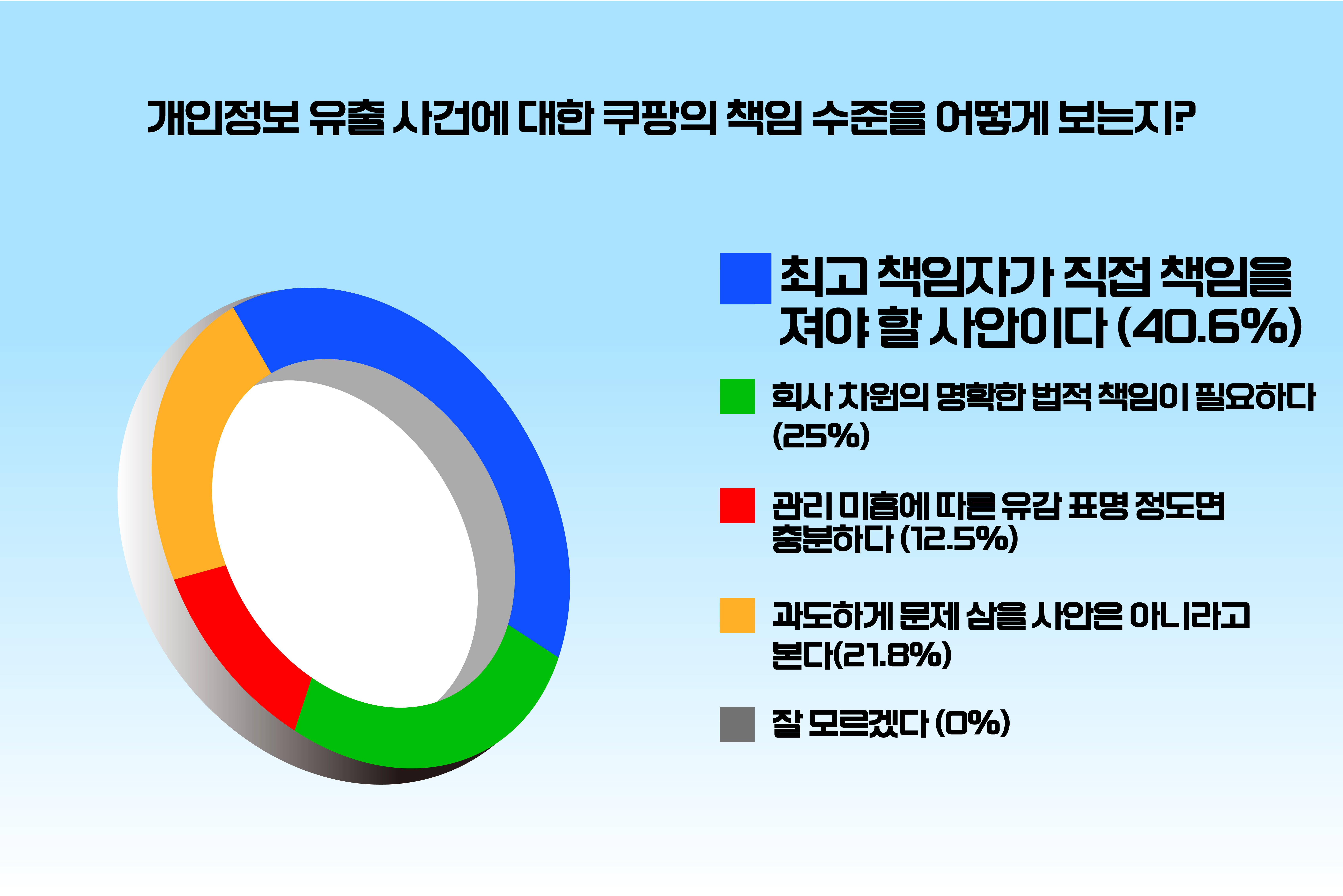 개인정보 유출 사건에 대한 책임을 묻는 질문에는 '최고 책임자에게 책임을 물어야 한다(40.6%)'는 비율이 가장 높은 것으로 나타났으며, '회사 차원의 명확한 법적 책임이 필요하다' 25%, '과도하게 문제 삼을 사안은 아니라고 본다' 21.8%, '관리 미흡에 따른 유감 표명 정도면 충분하다' 12.5%가 뒤를 이었다.